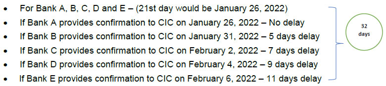 Bank A provides confirmation to the CIC on January 28, 2022 (21st day would be January 26, 2022) – 2 days delay by Bank A -