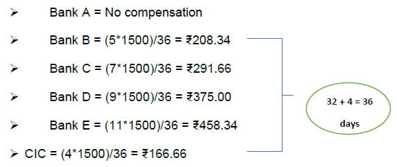 If the CIC resolves and provides rectified CIR to the complainant on February 6, 2022 – Total compensation of ₹600 shall be provided to the complainant, on a weighted average basis, as under, for a delay of 6 days beyond the permissible period of 30 days (i.e. in this case by January 31, 2022): Explanation: The delay of six days shall be apportioned by the CIs/CICs on weighted average of the extent of delay by each CIs/CICs. In the above case, the overall delay is 6 days and therefore the complainant shall be entitled for total compensation of ₹600. This needs to be apportioned between all the defaulting banks (in this case Bank B, C, D and E). Cumulatively, the delay of all the defaulting banks put together is 32 days (5+7+9+11 days). Therefore, the compensation amount of ₹600 shall be apportioned on weighted average of the delay by each CIs in relation to the overall delay of 32 days in this case. -