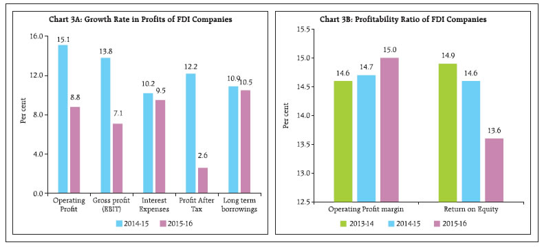 The performance of non-government non-financial foreign direct investment (FDI) companies deteriorated in 2015-16, with the pace of sales, gross value added and operating profit decelerating and significantly lower return on equity. Net earnings in foreign currencies turned positive on account of a substantial contraction in imports. Funds raised by these companies were predominantly used for fixed capital formation. This article presents an analysis of the financial performance of non-government non-financial (NGNF) foreign direct investment (FDI)1 companies for the financial year 2015-16, based on the audited annual accounts of 6,433 FDI companies which closed their accounts on March 31, 20162. Of these companies, 593 were public limited companies and the other 5,840 were private limited companies. These companies were classified into various industry groups on the basis of the information available on activity in the corporate identity number (CIN) of the company. FDI was mostly received in 4,070 services sector companies, of which 1,292 were engaged in computer and related activities. In the manufacturing sector, the bulk of FDI was received in machinery and machine tools. Data on FDI companies for 2015-16 were released in April 2017 as a press release on the Reserve Bank’s website along with explanatory notes. The article is organised into seven sections. In section 1, the performance of FDI companies is assessed in terms of sales and output (gross value added – GVA). Section 2 deals with exports and imports of these companies. Profit generating capacity as well as returns are presented in section 3. Section 4 discusses the capital structure and debt serviceability, while the composition of assets in the financial structure of FDI companies is set out in section 5. Funds raised from various sources and utilisation of these funds in various assets is addressed in section 6. Concluding observations are given in section 7. 1. Income and Expenditure 1.1 Sales growth of FDI companies decelerated in 2015-16, consistent with the pattern of sales in non-FDI companies, but was comparatively better than the latter at the aggregate level (Chart 1A and Statement 1). 1.2 The slow down in sales growth was observed across manufacturing and services sectors companies. In the manufacturing sector, sales lost pace across industry groups except motor vehicles and other transport equipment and electrical machinery and apparatus (Statement 1). 1.3 On the expenditure side, operating expenses decelerated mainly due to softening of raw materials costs and easing power and fuel prices. Expenditure on research and development (R&D), which plays an important role in sustaining the business of a company, accelerated and as a result, royalty paid by FDI companies also rose marginally (Chart 1B and Statement 1). 1.4 Output as measured in terms of gross value added (GVA) moderated, reflecting the decline in sales growth and this pattern was also observed in non-FDI companies. Moderation in the growth of GVA occurred in the manufacturing and the services sectors of FDI companies though they outperformed non-FDI companies at the aggregate level as well as at the sectoral level (Statement 1). 2. Earnings and Expenditure in Foreign Currencies 2.1 Export intensity measured as the ratio of exports to sales weakened gradually over the three-year period 2013-14 to 2015-16. This led to deceleration in growth of total earnings in foreign currencies. However, there was a net inflow of foreign currencies due to a substantial contraction in imports. The situation was exactly the opposite for non-FDI companies in the manufacturing sector, where exports contracted but imports expanded in 2015-16 (Chart 2A, Chart 2B and Statement 1). 2.2 The improvement in export performance of FDI companies in the manufacturing sector was largely contributed by entities producing chemical and chemical products and motor vehicles and other transport equipment. In the services sector, export intensity and export growth softened mainly for services related to wholesale and retail trade across FDI and non-FDI companies (Statement 1). 3. Profitability 3.1 Operating profit and gross profit recorded subdued growth, with persistently high interest expenses pulling down the growth of profit after tax (PAT) significantly. Profit parameters for non-FDI companies also decelerated significantly in 2015-16 (Chart 3A and Statement 1). 3.2 The operating profit margin of FDI companies was maintained in 2015-16, but their return on equity (RoE), measured as ratio of PAT to net worth, declined, gradually over the three-year period 2013-14 to 2015-16. Operating profit improved in the manufacturing sector in most of the industry groups except for food products and beverages and machinery and machine tools. In the services sector, however, the operating profit margin decelerated in all the major industry groups. Similarly, operating profit margin of non-FDI companies in the manufacturing sector improved marginally but declined in the services sectors (Chart 3B, Statement 1 and Statement 2). 4. Capital Structure and Debt Serviceability 4.1 The balance sheets of FDI companies expanded, but at a slower pace than in the preceding year. The composition of liabilities showed that the shares of shareholders’ funds and the long-term borrowings in total liabilities increased marginally in 2015-16 with a corresponding reduction in the share of short-term borrowings (Chart 4 and Statement 2). 4.2 The leverage ratio (ratio of total borrowings to equity) for FDI companies came down gradually, indicating deleveraging. While the leverage ratio declined marginally in the services sector mainly for companies involved in transport, storage and communication, the leverage ratio had moved up marginally in the manufacturing sector especially for companies in food products and beverages and chemical and chemical products. In contrast with the FDI companies, the leverage ratio of no