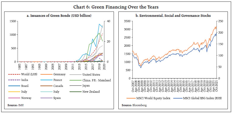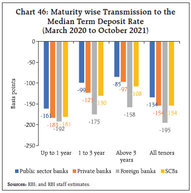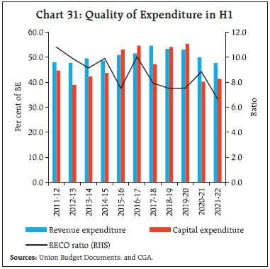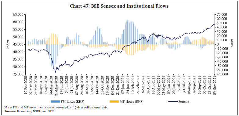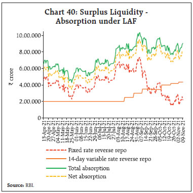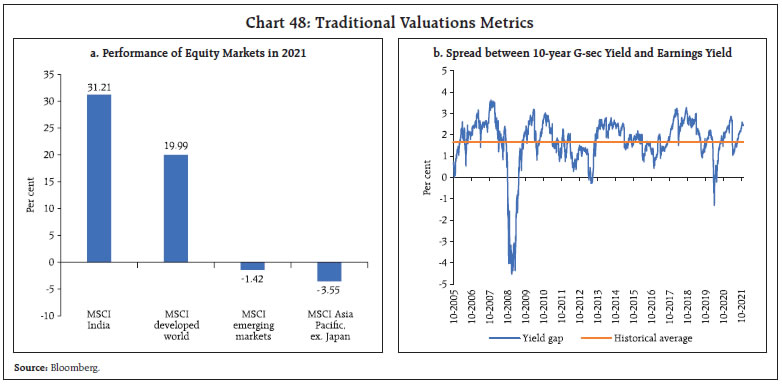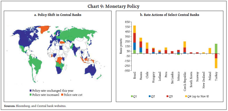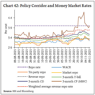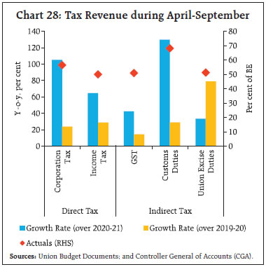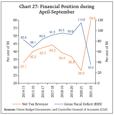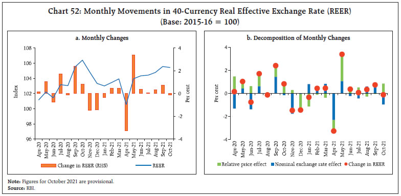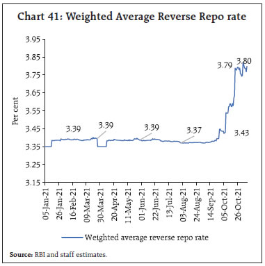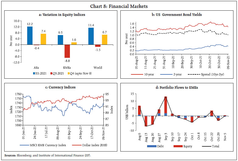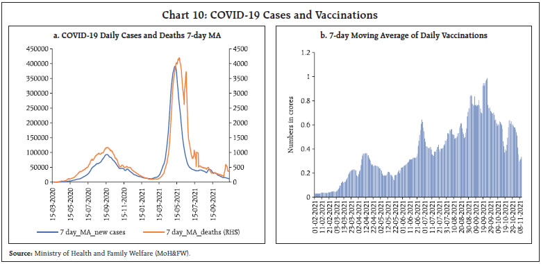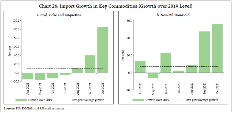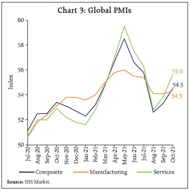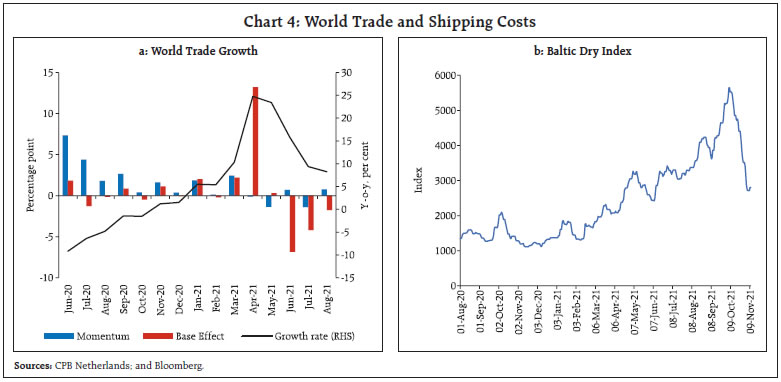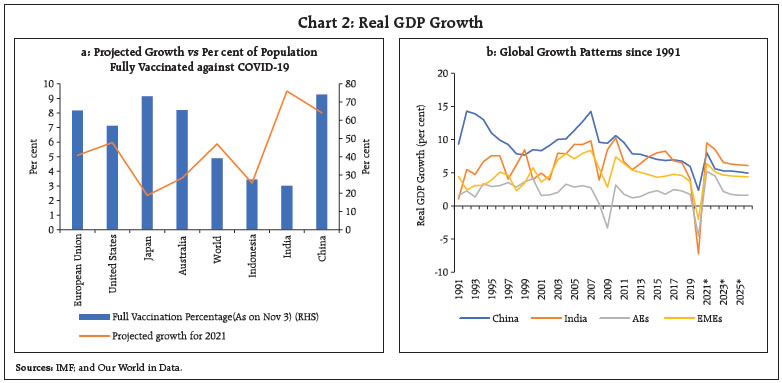 The global economic outlook remains shrouded in uncertainty, with headwinds from multiple fronts. In India, the recovery gained strength, though the speed and pace of improvement remains uneven across different sectors of the economy. Indicators of aggregate demand posit a brighter near-term outlook than before. On the supply side, the Rabi season has set in early on a positive note on the back of a record Kharif harvest and manufacturing is showing improvement in overall operating conditions, while services are in strong expansion mode. Overall monetary and credit conditions stay conducive for a durable economic recovery to take root. Introduction Since the last print of this article in October 2021, the economy is gradually healing amidst an uncertain and volatile global environment, battered by supply chain and logistics disruptions, inflation shocks and geo-political tensions. Incoming high frequency indicators show that the recovery is taking hold in several spheres, though some others are still lagging behind. With the gradual uptick in confidence, mobility indicators have edged up. The job market is exhibiting signs of ebullience on the back of uptick in business optimism and faster pace of vaccination. India’s merchandise exports have staged a smart turnaround, with surging double digit growth for the eighth consecutive month in a row. Collections under the goods and services tax (GST) have marked their second highest level in October since its introduction on the back of better tax administration and ongoing economic recovery. The issuance of e-way bills has been the highest in their history, which bodes well for GST collections going forward. After exhibiting moderation in the month of September 2021, power consumption has registered an uptick despite supply side constraints. The headline manufacturing purchasing managers’ index (PMI) recorded expansion for the fourth consecutive month in October with anticipation of an improvement in demand conditions. The services sector is convalescing with the headline PMI rising to a decadal high in the same month. With attractive offers by developers amidst the festival season, property registrations have also surged. Supported by the decadal low interest rates, softening inflation and a modest current account surplus, the Indian economy is poised to regain the ground lost to the pandemic and re-emerge as among the fastest growing countries in the world. Set against this backdrop, the remainder of the article is structured into five sections. Section II sketches the rapidly evolving developments in the global economy. The evolution of the domestic economy is laid out in Section III. Section IV evaluates the domestic financial conditions, while the last Section sets out concluding remarks. II. Global Setting Global economic activity is shedding momentum with supply chain disruptions turning more protracted than previously anticipated. Lockdowns, labour shortages, disruptions to logistics networks, and capacity constraints have resulted in big increases in freight costs and delivery times. As shown by the IHS Markit suppliers’ delivery times index, delivery times in the US and the European Union (EU) have hit record highs since late 2020 (Chart 1). Supply constraints across sectors and economies have exacerbated the surge in energy prices and inflation risks, propelling more central banks to resort to policy normalisation, even as the global recovery remains uneven and frail. In addition, a widening vaccine divide amidst slow inoculation rates has kept most developing countries on the back foot, accentuating the risks of a delayed turnaround in the global economy (Chart 2a). With this prolonged health crisis, most emerging market economies (EMEs) will likely bear lasting scars of the pandemic, undermining their growth rates which were already exhibiting a downtrend following the rebound from the global financial crisis (Chart 2b).  US GDP growth nosedived to 2.0 per cent (q-o-q, SAAR1) in Q3:2021 from 6.7 per cent in Q2. Resurgence in infections together with supply shortages weighed heavily on consumption and production activity, while fall in government assistance payout, residential fixed investment and exports added further to the downside. For China, growth momentum lost its pace in Q3, with the economy expanding at 4.9 per cent (y-o-y) vis-a-vis 7.9 per cent in Q2 as factory activity took a major hit amidst multiple headwinds. The Euro area, unlike its peers, sustained the recovery in Q3, growing by 9.1 per cent (q-o-q, SAAR) on top of 8.7 per cent in Q2, primarily on the back of strong domestic demand and exports. The global composite PMI accelerated to a three-month high in October with stronger upturn in services sector offsetting weaker expansion in manufacturing activity. Services activity strengthened across business, consumers and financial categories, underpinned by strong new order intakes. Growth in manufacturing, on the other hand, remained subdued amidst substantial input shortages, rising cost inflation and stalling export trade (Chart 3).   The United Nations Conference on Trade and Development (UNCTAD) in its October release, highlighted that the global trade exhibited a strong recovery in H1:2021, surpassing its pre-pandemic level of 2019 and is likely to sustain the growth in H2:2021. Accordingly, it projects the global trade value in 2021 to be about 20 per cent and 28 per cent higher than what was recorded in 2019 and 2020, respectively. The trade recovery, however, remains uneven with smaller economies struggling to catch up with the pace of exports growth in their larger counterparts. On average, goods exports of smaller economies are still 25 per cent below pre-pandemic levels. Granular data for monthly merchandise trade volume indicate that y-o-y growth decelerated for the fourth consecutive month in August, albeit at a slower pace, as monthly momentum turned positive post its decline in July (Chart 4a). T