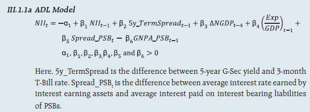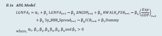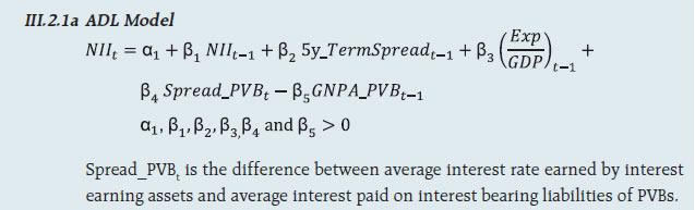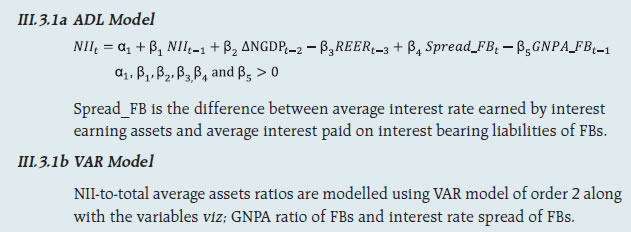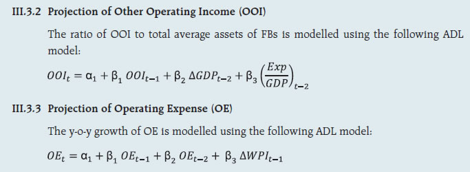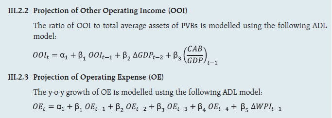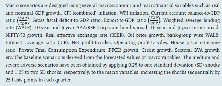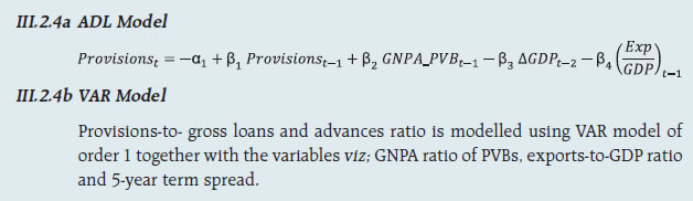 2.1 Scheduled Commercial Banks (a) Banking stability map and indicator The banking stability map and indicator present an overall assessment of changes in underlying conditions and risk factors that have a bearing on the stability of the banking sector during a period. Existing methodology has been revised by replacing a few variables (financial ratios) of the existing dimensions, incorporating an additional dimension and changing to equal-weighting. The six composite indices would now represent risk in six dimensions - soundness, asset-quality, profitability, liquidity, efficiency and sensitivity to market risk. Each composite index is a relative measure of risk during the sample period used for its construction, where a higher value would mean higher risk in that dimension. The financial ratios used for constructing each composite index are given in Table 1. Each financial ratio is first normalised for the sample period using the following formula: where Xt is the value of the ratio at time t. If a variable is negatively related to risk, then normalisation is done using 1– Yt. Composite index of each dimension is then calculated as a simple average of the normalised ratios in that dimension. Finally, the banking stability indicator is constructed as a simple average of these six composite indices. Thus, each composite index or the overall banking stability indicator takes values between zero and one. | Table 1: Ratios used for constructing the banking stability map and indicator | | Dimension | Ratios | | Soundness | CRAR # | Nonperforming loans net of provisions to capital | Tier 1 capital to assets # | | | Asset- Quality | Gross NPAs to Total Advances | Provisions to nonperforming loans # | Sub-Standard Advances to Gross NPAs # | Restructured Standard Advances to Standard Advances | | Profitability | Return on Assets # | Net Interest Margin # | Growth in Profit Before Tax # | Interest margin to gross income # | | Liquidity | Liquid Assets to Total Assets # | Liquidity Coverage Ratio # | Customer Deposits to Total Assets # | Non-Bank Advances to Customer-Deposits | | Efficiency | Cost to Income | Business (Credit + Deposits) to Staff Expenses # | Staff Expenses to Total Expenses | | | Sensitivity to market risk | RWA (market risk) to capital | Trading income to gross income | | | | Note: # Negatively related to risk. | (b) Macro stress testing Macro-stress test ascertains the resilience of banks against macroeconomic shocks by assessing the impact of macro shocks on capital adequacy of a set of major scheduled commercial banks (46 banks presently). Macro-stress test attempts to project capital ratios over a one-year horizon, under a baseline and two adverse (medium and severe) scenarios. The macro-stress test framework consists of (i) designing the macro scenarios, (ii) projection of GNPA ratios, (iii) projection of profit after tax (PAT), (iv) projection of sectoral probability of default (PD) and (v) projection of capital ratios. I. Designing Macro Scenarios II. Projection of GNPA ratios GNPA ratios are projected for each of the three bank groups viz; Public Sector Banks (PSBs), Private Sector Banks (PVBs) and Foreign Banks (FBs). Natural logs of GNPA ratios of these bank-groups are modelled using two complementary econometric models viz; (i) Autoregressive distributed lag (ADL) model and (ii) Vector auto regression (VAR) model. The values projected based on both these models are averaged to arrive at the final projections of GNPA ratios for each bank-group. The natural logs of GNPA ratios of each bank group are modelled as follows: II.1 Public Sector Banks II.1b VAR Model Log GNPA ratio of PSBs along with the macro variables viz; Nominal GDP growth and 5-year BBB bond spread are modelled using VAR model of order 1. II.2 Private Sector Banks II.3b VAR Model Log GNPA ratio of FBs along with the macro variables viz; WALR of FBs, Exports-to-GDP ratio, Oil price growth and CPI inflation are modelled using VAR model of order 1. II.4 All SCBs The system-level GNPA ratios are projected by aggregating the bank-group level projections using weighted average with gross loans and advances as weights. The projections are done under the baseline and adverse scenarios. III. Projection of PAT The components of PAT such as, net interest income (NII), other operating income (OOI), operating expenses (OE) and provisions are projected for each of the bank-groups using the following models. III.1 Public Sector Banks III.1.1 Projection of Net Interest Income (NII) NII is the difference between interest income and interest expense. The ratio of NII to total average assets of PSBs is modelled using the following ADL and VAR models and the projected values based on these models are averaged to arrive at the final projections. III.1.1b VAR Model NII-to-total average assets ratio is modelled using VAR model of order 1 together with the variables viz; incremental GNPA ratio of PSBs, NIFTY 50 annual growth rate, 5-year term spread, and incremental interest rate spread of PSBs. III.1.4 Projection of Provisions The ratio of Provisions to gross loans and advances of PSBs is modelled using the following ADL and VAR models and the projected values based on these models are averaged to arrive at the final projections. III.1.4b VAR Model Provisions-to- gross loans and advances ratio is modelled using VAR model of order 2 along with the variables viz; GNPA ratio of PSBs, 5-year term spread and gross fiscal deficit. III.2 Private Sector Banks III.2.1 Projection of Net Interest Income (NII) The ratio of NII to total average assets for PVBs is modelled using the following ADL and VAR models and the projected values based on these models are averaged to arrive at the final projections. III.2.1b VAR Model NII-to-total average assets ratios are modelled using VAR model of order 1 along with the variables viz; GNPA ratio of PVBs, NIFTY 50 annual growth rate and interest rate spread of PVBs. III.2.4 Projection of Provisions