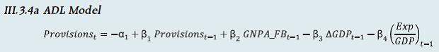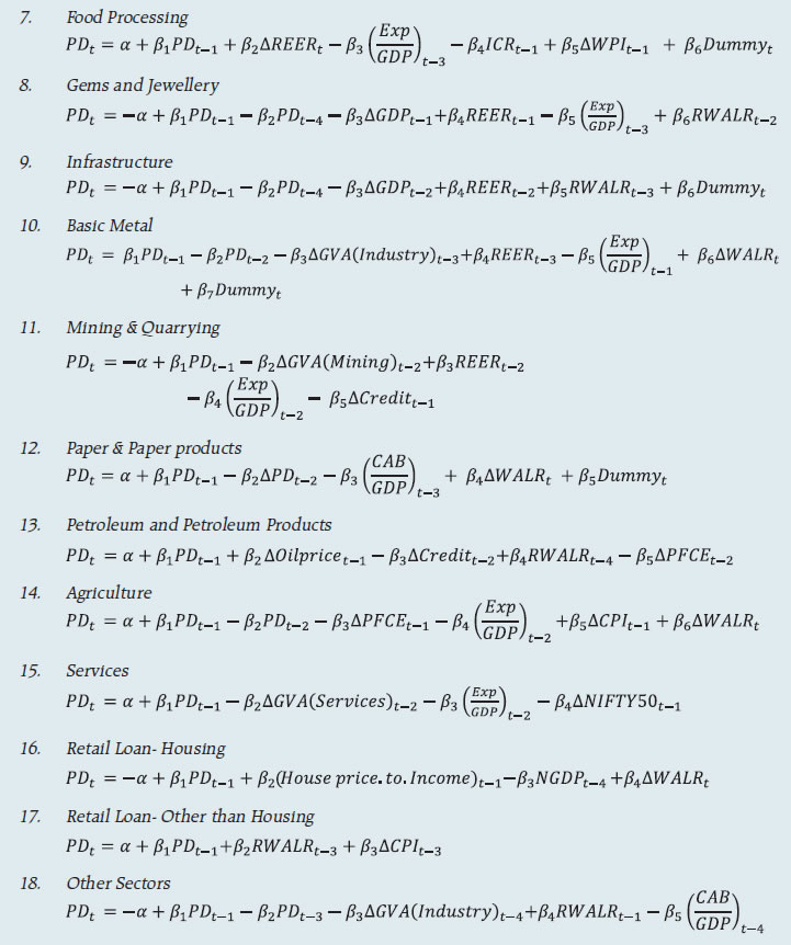 Finally, bank-wise PAT is projected by appropriately applying the aforesaid identity on the projected values of components derived in the previous step. IV. Projection of Sectoral PDs Sectoral PDs of 18 sectors/sub-sectors are modelled using ADL models and are projected for four quarters ahead under assumed baseline as well as adverse scenarios. The 18 sectors are listed in Table 2. | Table 2: List of selected sectors/sub-sectors | | Sr. No. | Sector | Sr. No. | Sector | | 1 | Engineering | 10 | Basic Metal and Metal Products | | 2 | Auto | 11 | Mining | | 3 | Cement | 12 | Paper | | 4 | Chemicals | 13 | Petroleum | | 5 | Construction | 14 | Agriculture | | 6 | Textiles | 15 | Retail-Housing | | 7 | Food Processing | 16 | Retail-Others | | 8 | Gems and Jewellery | 17 | Services | | 9 | Infrastructure | 18 | Others |