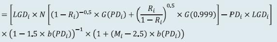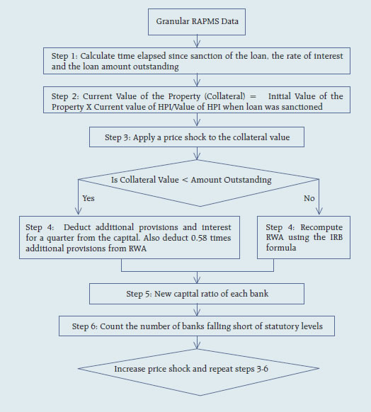 V. Projection of Capital Ratios Capital projections are made for each of the 46 banks under baseline and adverse stress scenarios. Capital projections are made by estimating risk-weighted assets (RWAs) using internal rating based (IRB) formula and under the conservative assumption that only 25 per cent of PAT would be transferred to capital funds in the subsequent period, as per the minimum regulatory requirements. The formulae used for projection of CRAR and Common Equity Tier 1 (CET1) capital ratio are given below: PAT is projected using the models listed in the previous section. RWA (others), which is total RWA minus RWA of credit risk, is projected based on average growth rate observed in the past one year. RWA (credit risk) is estimated using the IRB formula given below: IRB Formula: Bank-wise RWAs for credit risk were estimated using the following IRB formula; where, EADi is exposure at default of a bank in the sector i (i=1,2….n). Ki is minimum capital requirement for the sector i which is calculated using the following formula: Capital requirement (Ki) where, LGDi is loss given default of sector i, PDi is probability of default of sector i, N(..) is cumulative distribution function of standard normal distribution, G(..) is the inverse of the cumulative distribution function of standard normal distribution, Mi is average maturity of loans of sector i (which is taken 2.5 for all sectors in this case), b(PDi) is smoothed maturity adjustment and Ri is the correlation of sector i with the general state of the economy. Calculation of both, b(PD) and R depends upon PD. The aforesaid IRB formula requires three major inputs, viz; sectoral PD, EAD and LGD. Here, annual slippage of the sectors are assumed as proxies of sectoral PDs. PD of a particular sector is assumed as the same for each of the 46 selected banks. EAD of a bank for a particular sector is considered as the total outstanding loan (net of NPAs) of the bank in that sector. LGD is assumed as 60 per cent (broadly as per RBI guidelines on ‘Capital Adequacy - The IRB Approach to Calculate Capital Requirement for Credit Risk’) under the baseline scenario, 65 per cent under medium stress scenario and 70 per cent under the severe stress scenario. Using these formulae, assumptions and inputs, the capital ratio of each bank is estimated. The differences between IRB-based capital ratios estimated for the latest quarter and those of the ensuing quarters projected under the baseline scenario and the incremental change in the ratios from baseline to adverse scenarios are appropriately applied on the latest observed capital ratios (under Standardised Approach) to arrive at the final capital ratio projections. (c) Housing Price and Financial Stability – Sensitivity Analysis Sensitivity analysis for house prices has been carried out using data of Residential Asset Price Monitoring Survey (RAPMS), a quarterly survey through which RBI collects data from select scheduled commercial banks (SCBs) and housing finance companies (HFCs) on fresh housing loans sanctioned by them in selected cities during a quarter. I. Following assumptions and calculations have been used for the sensitivity analysis: 1. In order to account for the entire outstanding housing loans, following scaling factor was used for each bank: 2. RAPMS data received from 20 PSBs and PVBs from Q4: 2008-09 till Q4:2021-22 are used for the analysis. 3. The property purchased is the collateral for all the loans. 4. The loan and the EMI due remain constant. 5. There is no default till date i.e. all EMIs for all loans are paid as scheduled. 6. Loan amount outstanding is calculated based on sanctioned amount, EMI, derived rate of interest and time elapsed since inception. 7. The derived rate of interest is calculated based on the loan amount sanctioned, maturity period and EMI. 8. Capital to risk-weighted assets ratio (CRAR) of each bank under a price shock scenario is computed by adjusting both the numerator (capital) and the denominator [risk-weighted assets (RWA)] of CRAR. Initial risk weights are taken as per the RBI circular in vogue at the time of origination of the loans. The following method is attempted to recompute CRAR: (a) Housing loans where the shocked collateral value goes below the loan amount outstanding are subjected to the norms of substandard loans: • Additional provisions and interest loss for one quarter are deducted from the numerator (capital). • For the same loans a part of the additional provisioning is deducted from the denominator New RWA for Delinquent Loans = Old RWA - 0.58 x Additional provisioning RWA density being 0.58. (b) RWA for other loans is estimated by internal rating based (IRB) formula: RWA = K x 12.5 x EAD Exposure at default (EAD) is the loan amount outstanding, and K is the capital requirement for a defaulted exposure given by: N(..) is cumulative distribution function of standard normal distribution, G(..) is inverse of cumulative distribution function of standard normal distribution, M is effective maturity of loans (which is taken as 2.5), bPD is smoothed maturity adjustment and R is correlation of the sector with the general state of the economy. Calculation of both, bPD and R depend upon PD. II. The following process is followed: (d) Single factor sensitivity analysis -Stress testing As a part of quarterly surveillance, stress tests are conducted covering credit risk, interest rate risk, liquidity risk etc. and the resilience of commercial banks in response to these shocks is studied. The analysis is done on individual SCBs as well as on the system level. I. Credit risk (includes concentration risk) To ascertain the resilience of banks, the credit portfolio was given a shock by increasing GNPA ratio for the entire portfolio. For testing the credit concentration risk, default of the top individual borrower(s) and the largest group borrower(s) was assumed. The analysis was carried out both at the aggregate level as well as at the i