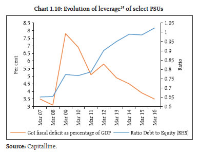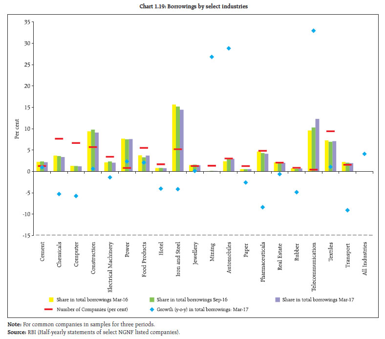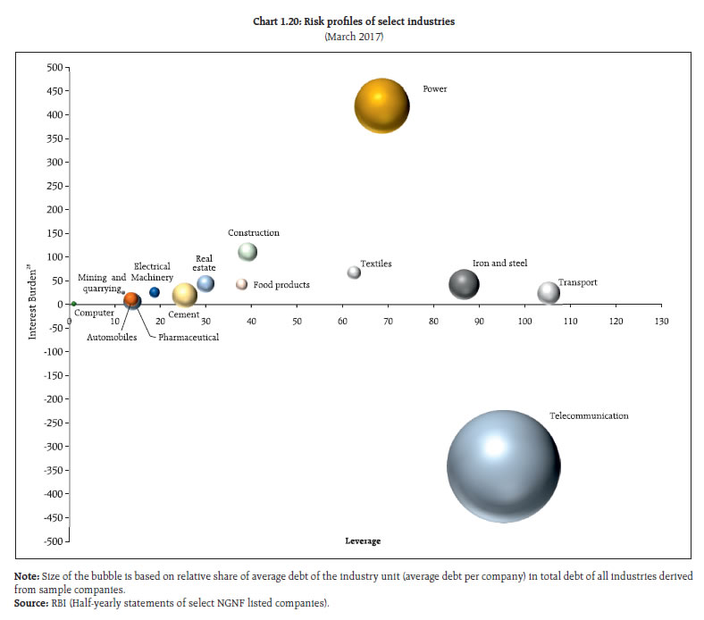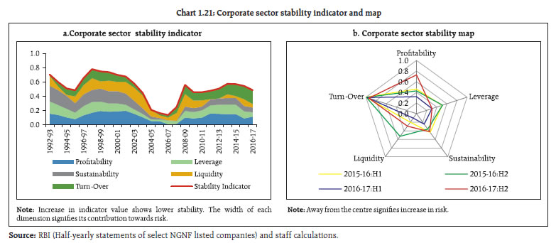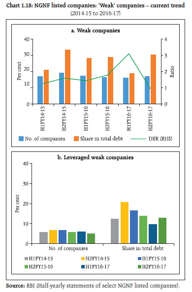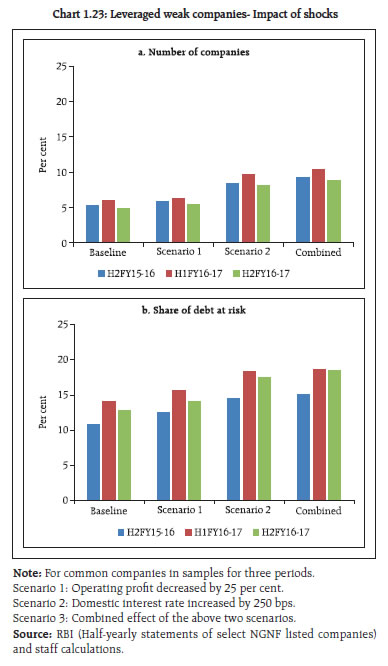 | Table 1.3: NGNF listed companies: Tail risk in corporate leverage | | (per cent) | | Leverage | Number of companies (as percentage of total companies) | Share of companies in total debt of the sample | | Sep'15 | Mar'16 | Sep'16 | Mar'17 | Sep'15 | Mar'16 | Sep'16 | Mar'17 | | Negative Net worth or DER >= 2 | 10.6 | 10.9 | 11.5 | 10.4 | 23.1 | 20.6 | 16.0 | 27.6 | | Negative Net worth or DER >= 3 | 9.2 | 9.9 | 10.5 | 9.5 | 20.6 | 19.0 | 14.5 | 19.5 | | Source: RBI (Half-yearly statements of select NGNF listed companies) | Tail risk 1.26 Share of debt of ‘leveraged24’ companies in the sample increased from 20.6 per cent to 27.6 per cent during the period 2016-17. However, the share of total debt of ‘highly leveraged25’ companies showed a smaller increase during the same period (Table 1.3). Debt servicing capacity 1.27 The debt servicing capacity and leverage of ‘weak26’ companies in the sample deteriorated considerably in 2016-17. Analysis shows that around 17 per cent of the sample companies were ‘weak’ as at end March 2017, compared to 16.4 per cent in March 2016. The share of these ‘weak’ companies in total debt of the sample increased to 30.2 per cent during the second half of 2016-17 from 28.7 per cent during the second half of 2015-16. However, the debt-equity ratio (DER) of these ‘weak’ companies declined to 1 from 1.8 during the same period. The proportion of ‘leveraged weak27’ companies in the sample declined to 5 per cent from 5.7 per cent during this period. The share of ‘leveraged weak’ companies in total debt of the sample also declined (Chart 1.18). Sectoral analysis 1.28 The total borrowings by companies in chemical, computer, electrical machinery, hotel, iron & steel, papers, pharmaceutical, real estate, rubber and transport industries decreased during 2016 -17. On the other hand, cement, construction, power, food products and textile industries showed some increase in borrowings. Automobile and telecommunication industries showed a substantial increase in borrowings (Chart 1.19). 1.29 A risk profile of select industries as at end March 2017 showed that the telecommunication industry had the largest debt with negative profitability. The industry also had relatively high leverage. The power, construction and iron & steel industries suffered from relatively high leverage and high interest burden (Chart 1.20). Corporate sector risks 1.30 The corporate sector stability indicator and map29 (Chart 1.21) show that the overall risks to the corporate sector have further moderated in 2016-17. However, the risks due to lower demand (as seen from turnover)30 continues to impact the profitability. Sensitivity tests: resilience 1.31 The resilience of the NGNF listed companies to potential shocks from domestic interest rates and operating profits were assessed using sensitivity tests. 1.32 Stress tests (Chart 1.22) on sample companies reveal that decline in operating profits by 25 per cent (scenario 1) will increase the ‘share of debt’ held by weak companies by 2 per cent in H2:2016-17, whereas that increase would have been 5.8 per cent in H1:2016-17 under similar scenario. The share of ‘debt at risk31’ will increase by 7.8 per cent if domestic interest rate increases by 250 basis points (scenario 2) in H2:2016-17. Under the combined effect of both the scenarios, there would be a significant increase in number of weak companies and share of ‘debt at risk’ by around 17 per cent and 12 per cent respectively in H2:2016-17 .  1.33 Tests of resilience of leveraged weak companies show that under scenario 1 shock, ‘debt at risk’ of these companies will increase by about 1 per cent in H2:2016-17, the lowest in preceding three half years. On the other hand, under scenario 2 shock, ‘debt at risk’ of such companies will increase by around 5 per cent in H2:2016-17, the highest in the preceding three half years (Chart 1.23). |