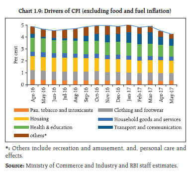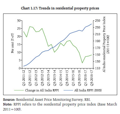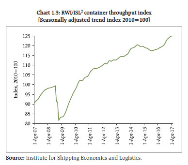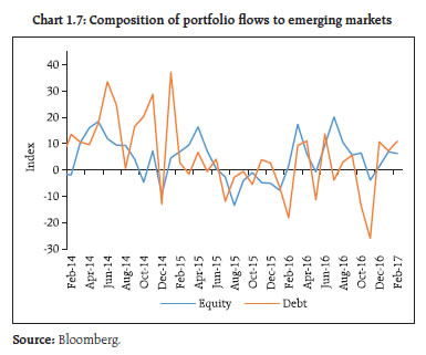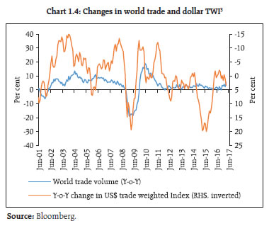 After years of lacklustre growth, the global economy seems poised for a turnaround. Amidst uncertainties surrounding the contours of fiscal reforms in the United States (US) and persistent populist urges across the global political economy, the underlying expectations of a smooth transition from accommodative monetary policy regimes to a normal rate cycle is evident in the behaviour of equity and fixed income markets. Domestically, government’s commitment to fiscal consolidation and political stability are providing comfort to investors about the continuation of reforms. However, revival of investment demand is important so as to make higher growth rates sustainable. The impact of demonetisation on exchange rates and portfolio flows was fleeting, while the liquidity condition eased significantly. Against asset quality concerns, credit intermediation by public sector banks (PSBs) has retrenched and that by Non-banking Financial Companies (NBFCs) and mutual funds has increased significantly. Going forward, growth is expected to pick up further. While inflation has fallen, focus remains on keeping the inflation close to 4 per cent on a durable basis. At the same time, there is a need to guard against complacency over the prevailing benign conditions in the global financial and commodity markets. Global backdrop 1.1 After years of lacklustre growth, the global economy seems headed for a turnaround as can be seen in the improvements in industrial production and the purchasing managers’ index (PMI), and financial conditions of advanced economies (AE) approaching a neutral condition (Charts 1.1 and 1.2). Notwithstanding concerns over rising protectionism, populism and emerging geopolitical conflicts, the world economic outlook for 2017 looks brighter as compared to 20161. Several factors seem to be contributing to this positive outlook –– the end of a big decline in resource sector investment spending, moderation of fiscal austerity in Europe with the Eurozone achieving faster growth than the US in 2016 and inflation just under the European Central Bank (ECB)’s target of 2 per cent, stimulus in China, moderating US dollar strength, prospects of an inflation uptick in Japan, partial reversal of commodity prices and market expectations of a somewhat moderated monetary accommodation withdrawal path in the US.   1.2 However, concerns remain amidst these positive sentiments. For instance, weaknesses in US output in Q1 2017, Chinese trade data for April pointing to moderating demand for imports and uncertainty about the US administration’s tax and fiscal policy. Geopolitical risks are elevated though the real concern is the perceived weakening of international institutional mechanisms to deal with them. At the same time, one has to await the on-going churning in political processes across the world to assess how much of the rhetoric on protectionism and populism will ultimately materialise. 1.3 In the meanwhile, notwithstanding the US decision to pull out of the Trans Pacific Partnership (TPP), there has been a steady increase in global trade (Chart 1.3) and there is a belief that rather than overhauling the existing trade agreements, the current US administration will only tweak them in an effort to address domestic political economy concerns. Furthermore, the US dollar in trade weighted terms has stopped rising, adding sheen to anything reported in dollar terms, such as trade (Chart 1.4). 1.4 A stronger growth outlook, resurgence in trade and the end of the dollar’s strength (Chart 1.4) have also reversed the commodity-driven emerging market-centred deflation that started in 2014, though recent Chinese efforts to restrict credit and curb leverage have started impacting the commodity space (Chart 1.5).  1.5 The global interest rate cycle, however, is yet to synchronise. Among the G-3 central banks, there appears to be a sequence towards withdrawal of monetary accommodation, with the FED ahead of the ECB and the ECB ahead of the Bank of Japan (BoJ). More importantly, from a financial market perspective, the FED appears to be moving cautiously towards paring back its balance sheet size, though the Triffin dilemma4 continues. Interestingly there is an alternative view that the FED’s release of collateral may be expansionary – rather than contractionary – enabling market participants to access secured funding markets. Such expansionary dimension of FED balance sheet size change is independent of the manner in which such changes happen. Illustratively, any non-investment of maturity proceeds by FED can be seen as initial investment and subsequent sale (release) of treasury (collateral). 1.6 One of the most significant changes in the world economy in the past couple of decades has been a decline in real interest rates and a commensurate increase in indebtedness. There is a view that the increase in indebtedness is partially attributable to central banks ‘obsession with near term price stability’ which means that so long as the increase in near term inflation is limited (partly held back by both the tailwinds of globalisation and credibility of central banks), they have little incentive to restrain the build-up of financial imbalances. Hence, there is a need for a more useful definition of a natural interest rate, which also ensures that ‘…the financial side of the economy to be on an even keel –– so that financial imbalances do not build up…’ (Borio, 2017)5. On the other hand, according to an OECD publication6, by extending the debt maturity profile, OECD sovereigns have bought some insurance against refinancing risks at the cost of some duration risks. Significantly, one of the negative fallouts of the more immediate ultra-low rates in the AEs has been a significant deficit in both public and private pension schemes. IMF’s Global Financial Stability Report (GFSR – October, 2016) attributes the shortfall in defined benefit schemes to falling interest rates, which in
