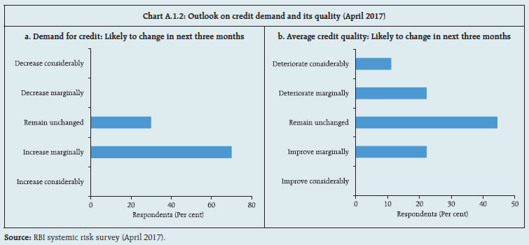 The systemic risk survey (SRS), the twelfth in the series, was conducted during April-May 20171 to capture the perceptions of experts, including market participants, on the major risks presently faced by the financial system. The survey results indicated that global risks were perceived as medium risks affecting the financial system. The risk perception on macroeconomic conditions, institutional positions and other general risks have also been categorised in the medium risk category in the current survey. Market risks, however, have been perceived to be in low risk category in this survey. Except the macro-economic risks, perception about other risks in this survey have increased as compared to the last survey (Figure A.1.1). Within global risks, the risks on account of global growth, sovereign contagion and commodity prices remained as medium risk. In the last half-year, the risk of global slowdown receded considerably. Within the macroeconomic risks group, risks on account of domestic growth, domestic inflation, capital flows, corporate sector, pace of infrastructure development, real estate prices and household savings were considered to be in medium risk category in the current survey. According to the respondents the risk from corporate sector, infrastructure development and fiscal deficit moved to the lower category. The respondents have rated the foreign exchange risk, equity price volatility and interest rate risk under medium risk category as part of the financial market risks. Among the institutional risks, the asset quality of banks, risk on account of capital requirement, credit growth and cyber risk were perceived as high risk factors (Figure A.1.2).   Majority of the participants in the current round of survey felt that the possibility of a high impact event occurring in the global financial system in the short term as well as in the medium term period is medium, while majority felt that possibility of occurrence of such event in the domestic financial system in the short term is low. However, close to half of the participants assign a medium probability to the occurrence of a high impact event occurring in the domestic financial system in the medium term. Most respondents continued to be fairly confident in the global financial system. There was a significant increase in the proportion of respondents in the current survey who were fairly confident of the stability of Indian financial system, while many had reflected in the last survey that they were very confident about the system (Chart A.1.1).   On the issue of likely changes in demand for credit in the next three months, the majority of the respondents were of the view that it will increase marginally. A majority of the respondents indicated that the average quality of credit would remain unchanged in the next three months (Chart A.1.2). |