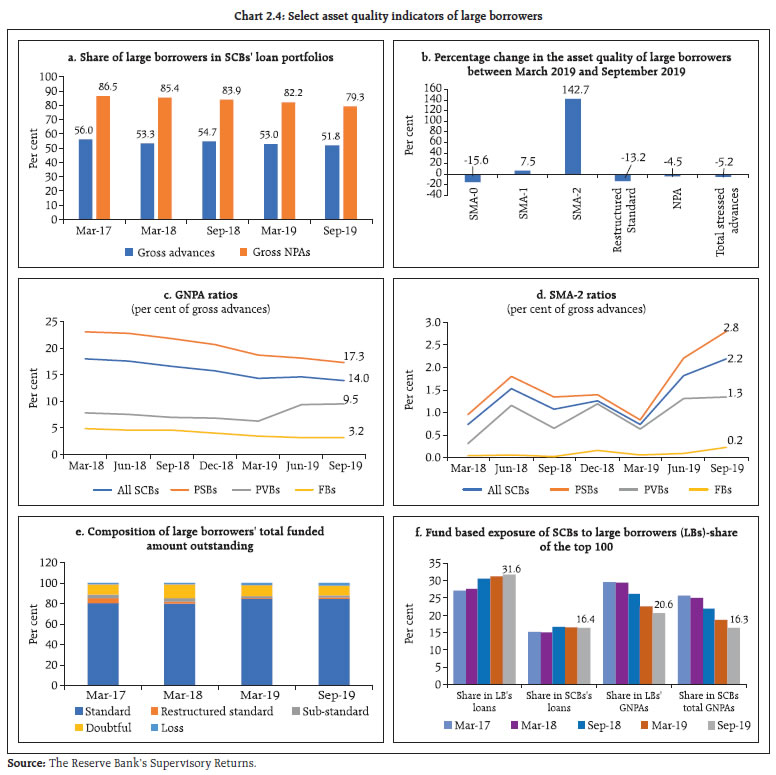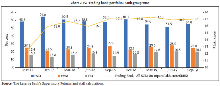 Scheduled commercial banks’ (SCBs) credit growth remained subdued at 8.7 per cent year-on-year (y-o-y) in September 2019, though private sector banks (PVBs) registered double digit credit growth of 16.5 per cent. SCBs’ capital adequacy ratio improved significantly to 15.1 per cent in September 2019 after the recapitalisation of Public Sector Banks (PSBs) by the Government. SCBs’ gross non-performing assets (GNPA) ratio remained unchanged at 9.3 per cent between March and September 2019. Provision coverage ratio (PCR) of all SCBs rose to 61.5 per cent in September 2019 from 60.5 per cent in March 2019 implying increased resilience of the banking sector. Macro-stress tests for credit risk show that under the baseline scenario, SCBs’ GNPA ratio may increase from 9.3 per cent in September 2019 to 9.9 per cent by September 2020 . This is primarily due to change in macroeconomic scenario, marginal increase in slippages and the denominator effect of declining credit growth. As per network analysis, total bilateral exposures between entities in the financial system registered a marginal decline in quarter ended September 2019. Among all the intermediaries, private sector banks (PVBs) saw the highest y-o-y growth in their payables to the financial system, while insurance companies recorded the highest y-o-y growth in their receivables from the financial system. Commercial paper (CP) funding amongst the financial intermediaries continued to decline in the last four quarters. The size of the inter-bank market continued to shrink with inter-bank assets amounting to less than 4 per cent of the total banking sector assets as at end-September 2019. This reduction, along with better capitalisation of PSBs led to a reduction in contagion losses to the banking system compared to March 2019 under various scenarios relating to idiosyncratic failure of a bank/non-banking finance company (NBFC)/housing finance company (HFC) and macroeconomic distress. Section I Scheduled commercial banks1 2 2.1 This section discusses SCBs’ soundness and resilience under two broad sub-heads: i) performance, and ii) resilience. The latter uses macro-stress tests through scenarios and single-factor sensitivity analyses. Performance 2.2 SCBs’ aggregate credit growth moderated to 8.7 per cent on a y-o-y basis in September 2019 from 13.2 per cent in March 2019; deposit growth improved to 10.2 per cent from 9.9 per cent (Chart 2.1a). The banking sector’s credit growth falling short of deposit growth was last seen during Q2:2016-17. Among bank groups, credit growth of public sector banks (PSBs) decelerated to 4.8 per cent (y-o-y) in September 2019 from 9.6 per cent in March 2019; private sector banks’ (PVBs) credit growth moderated to 16.5 per cent from 21 per cent. There was, however, a sharp contrast between the wholesale and retail credit3 growth in PVBs - wholesale credit grew at 7.2 per cent as against a retail credit growth of 27.2 per cent. Deposit growth in both PSBs and PVBs exceeded their credit growth, although deposit growth in PSBs remained relatively sluggish at 6.6 per cent y-o-y in September 2019 as against 19 per cent for PVBs.  2.3 Growth in net interest income (NII) slowed down to 13 per cent in September 2019 as compared to 16.5 per cent in March 2019, one possible reason being higher growth in deposits as compared to credit. However, due to higher growth in other operating income (OOI) (particularly driven by profits on securities trading in PSBs which increased about tenfold as compared to end-September 2018), SCBs were able to maintain better earnings before provisions and taxes (EBPT) growth (Chart 2.1b). Given that PSBs’ trading portfolio classified as held for trading (HFT) is miniscule, such an increase in profits on securities trading is possibly due to aggressive available for sale (AFS) positioning (paragraph 2.28). However, the AFS portfolio being part of the structural balance sheet typically does not have safeguards like risk limits / stop loss limits which are typically available for pure trading portfolios. Aggressive interest rate positioning in the structural balance sheet based on anticipated softening of rates may have significant adverse consequences if the anticipated rate softening fails to materialise. With regards to buffers against anticipated risks, PVBs’ provisions grew at a faster rate as compared to those of PSBs (Chart 2.1d and e). 2.4 PSBs’ profitability ratios were muted because of weak credit growth as well as slow resolution of non-performing assets (NPAs). PVBs’ profitability ratios also declined whereas foreign banks showed better profitability (Chart 2.1f and g). PSBs’ weak return on equity (RoE) and return on assets (RoA) numbers compared to their private sector counterparts continue to come in the way of their ability to raise equity capital from the market at a decent cost. 2.5 Post the corporate tax rate cut in September 2019, a few banks decided to exercise the option of lower tax rate available under Section 115BAA of the Income Tax Act, 1961. Hence, profit after tax (PAT) across different banks is strictly not comparable for Q2:2019-20 and H1:2019-20 financial results. Concurrently, certain banks have re-measured their accumulated deferred tax assets as on March 31, 2019 based on the lower rate prescribed and the resultant impact has been taken through the profit and loss account (P&L). Comparing the performance in H1:2019-20 across various categories of SCBs using Profit Before Tax (PBT) shows that RoA for PVBs has improved from 1.7 per cent (1.2 per cent based on PAT) as at end-September 2018 to 1.8 per cent (1.0 per cent based on PAT) as at end- September 2019 as opposed to a decrease in RoA based on PAT. For PSBs, RoA based on PBT improved from -1.0 per cent (-0.7 per cent based on PAT) as at end-September 2018 to 0 per cent (-0.1 per cent based on PAT) as at end-September 2019. On an aggregate basis RoA of SCBs based on PBT moved from 0 per