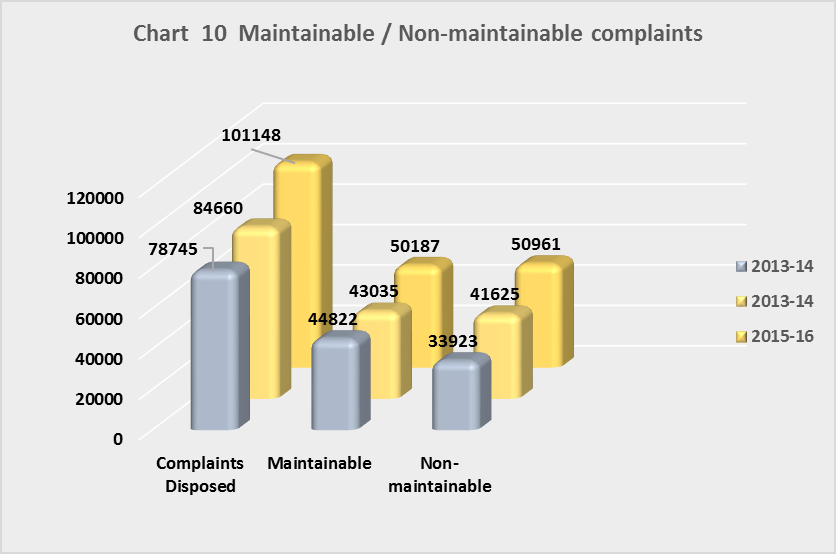 OBO-wise position of complaints disposed during the year 2015-16 is indicated in Table 10 below: | Table 10 - OBO-wise position of complaints disposed during 2015-16 | | OBO | Complaints pending at the beginning of the Year | Complaints Received during the Year | Complaints handled | Complaints Disposed | Pending at the end of the year | Rate of Disposal (%) | | Ahmedabad | 0 | 5909 | 5909 | 5909 | 0 | 100.00% | | Bengaluru | 174 | 5119 | 5293 | 5162 | 131 | 97.53% | | Bhopal | 1078 | 5748 | 6826 | 6610 | 216 | 96.84% | | Bhubaneswar | 6 | 3050 | 3056 | 3048 | 8 | 99.74% | | Chandigarh | 63 | 4571 | 4634 | 4593 | 41 | 99.12% | | Chennai | 87 | 8645 | 8732 | 8616 | 116 | 98.67% | | Guwahati | 16 | 1328 | 1344 | 1307 | 37 | 97.25% | | Hyderabad | 122 | 5910 | 6032 | 5695 | 337 | 94.41% | | Jaipur | 5 | 4664 | 4669 | 4437 | 232 | 95.03% | | Kanpur | 589 | 9621 | 10210 | 8753 | 1457 | 85.73% | | Kolkata | 71 | 4846 | 4917 | 4639 | 278 | 94.35% | | Mumbai | 402 | 12333 | 12735 | 11848 | 887 | 93.03% | | New Delhi | 932 | 22554 | 23486 | 21902 | 1584 | 93.26% | | Patna | 125 | 5003 | 5128 | 5035 | 93 | 98.19% | | Thiruvananthapuram | 108 | 3593 | 3701 | 3594 | 107 | 97.11% | | Total | 3778 | 102894 | 106672 | 101148 | 5524 | 95% | Disposal of complaints - Maintainable / Non-Maintainable 4.2 The complaints received in the OBOs are classified in two categories viz. Maintainable and Non-Maintainable. The complaints which do not fall under the grounds of complaint specified in Clause 8 of the BOS and those complaints, where procedure for filing the complaint is not adhered to as laid down in Clause 9 of the BOS, are classified as ‘Non-Maintainable’ complaints. All other complaints are classified as ‘Maintainable’ complaints and are dealt in accordance with the provisions of the BOS 2006. Non-Maintainable complaints are returned to the complainants stating the reason and requesting them to resubmit after following the procedure if these are within the specified grounds of complaints under Clause 8 of the BOS. One of the reasons for high proportion of Non-Maintainable complaints received in OBOs is the high level of confidence exists amongst the common bank customers in the Scheme coupled with lack of awareness about provisions of the Scheme. General feeling among the informed public is that by sending a complaint to the bank with a copy marked to Banking Ombudsman, helps in quick resolution of complaint. This factor contributes to the receipt of a large number of First Resort Complaints in OBOs i.e. the complaints sent directly to the OBO without first approaching the bank-branch for resolution. A study undertaken by RBI in the jurisdiction of OBO, New Delhi to ascertain the reasons for sudden spurt in the number of complaints has corroborated the fact that the people repose confidence in the BO Scheme. (Please see Box I - A study on spurt in complaints at the Office of Banking Ombudsman, New Delhi). Table 11 and Chart 10 indicate the number of Maintainable and Non-Maintainable complaints disposed by all the OBOs during the last three years. Out of the total 101148 complaints disposed during the year, 50% complaints were Maintainable. | Table-11 Maintainable / Non-maintainable complaints | | | 2013-14 | 2014-15 | 2015-16 | | Complaints Disposed | 78745 | 84660 | 101148 | | Maintainable | 44822 (57%) | 43035 (51%) | 50187 (50%) | | Non-maintainable | 33923 (43%) | 41625 (49%) | 50961 (50%) | | (* Figures in brackets indicate percentage to Complaints Disposed) |