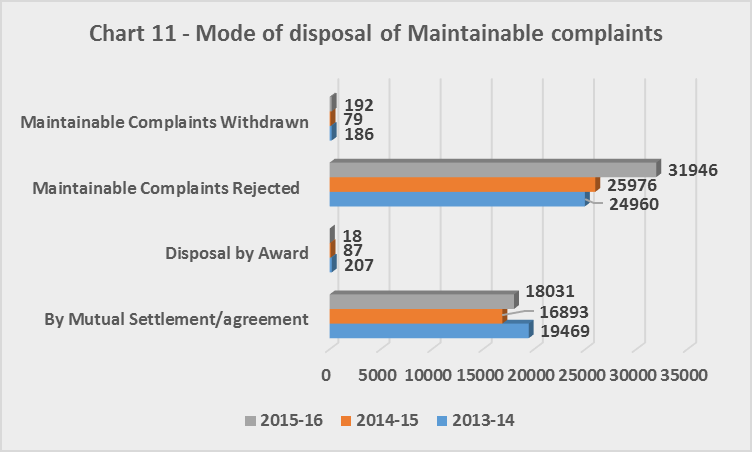 Mode of disposal of Maintainable complaints 4.3 The objective of the BOS is to facilitate amicable settlement of dispute by conciliation and mediation so that the relationship between the customer and the banker is maintained. The Scheme follows a non-disruptive mode of resolution of complaints to the extent possible. This results in less number of Awards issued by the Banking Ombudsman. In terms of Clause 7(2) of the BOS the BO shall facilitate resolution of complaints by settlement, by agreement or through conciliation and mediation between the bank and the aggrieved parties or by passing an Award in accordance with the Scheme. BO gives a decision or passes an Award when the mediation and conciliation efforts fail to arrive at resolution. Table 12 and Chart 11 below indicate the mode of disposal of Maintainable complaints. | Table 12 - Mode of disposal of Maintainable complaints | | Disposal of Maintainable Complaints | 2013-14 | 2014-15 | 2015-16 | | By Mutual Settlement/agreement | 19469 (43.5%) | 16893 (39.3%) | 18031 (35.93%) | | Disposal by Award | 207 (0.5%) | 87 (0.2%) | 18 (0.04%) | | Maintainable Complaints Rejected | 24960 (55.6%) | 25976 (60.3%) | 31946 (63.65%) | | Maintainable Complaints Withdrawn | 186 (0.4%) | 79 (0.2%) | 192 (0.38%) | | Total Maintainable complaints disposed | 44822 | 43035 | 50187 | | (* Figures in brackets indicate percentage to Maintainable Complaints) |