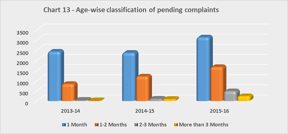 OBOs disposed of 95% of the complaints handled during the year. At the end of the year, 5524 (5%) complaints were pending at all OBOs. Out of these, 2.94% complaints were pending for less than one month, 1.57% complaints were pending between one to two months, 0.45% complaints were pending between two to three months and only 0.2% complaints were pending beyond three months. Compared to last year, there was 21% increase in complaints received during the year. First time since introduction of the BOS, the complaints figure crossed 1 lakh mark. Despite the significant increase in the volume of complaints received by OBOs, with concerted efforts OBOs disposed of 95% of the complaints. Complaints per officer 4.11 During the year 2015-16 there were 134 desk officers handling the complaints received in all OBOs. On an average proportion of complaints per officer worked out to 768. Table 19 and Chart 14 below indicate complaints 'per officer' in respective OBOs. | Table 19 – Complaints per officer | | Office | 2013-14 | 2014-15 | 2015-16 | | No. of complaints received | No. of officers | No. of complaints per officer | No.of complaints received | No. of officers | No. of complaints per officer | No. of complaints received | No. of officers | No. of complaints per officer | | Ahmedabad | 4588 | 13 | 353 | 4965 | 10 | 497 | 5909 | 8 | 739 | | Bengaluru | 4101 | 11 | 372 | 4610 | 10 | 461 | 5119 | 6 | 853 | | Bhopal | 4907 | 7 | 701 | 5451 | 6 | 909 | 5748 | 6 | 958 | | Bhubaneswar | 1498 | 4 | 374 | 2448 | 6 | 408 | 3050 | 4 | 763 | | Chandigarh | 3162 | 8 | 395 | 3131 | 8 | 391 | 4571 | 7 | 653 | | Chennai | 8775 | 13 | 675 | 8285 | 11 | 753 | 8645 | 9 | 961 | | Guwahati | 770 | 2 | 385 | 1054 | 2 | 527 | 1328 | 2 | 664 | | Hyderabad | 4477 | 9 | 497 | 4366 | 9 | 485 | 5910 | 8 | 739 | | Jaipur | 4104 | 9 | 456 | 4088 | 6 | 681 | 4664 | 7 | 666 | | Kanpur | 8389 | 20 | 419 | 8818 | 13 | 678 | 9621 | 12 | 802 | | Kolkata | 4698 | 18 | 261 | 5277 | 15 | 352 | 4846 | 12 | 404 | | Mumbai | 9965 | 19 | 524 | 10446 | 18 | 580 | 12333 | 18 | 685 | | New Delhi | 11045 | 22 | 502 | 14712 | 24 | 613 | 22554 | 23 | 981 | | Patna | 3253 | 4 | 813 | 4456 | 3 | 1485 | 5003 | 4 | 1251 | | Thiruvananthapuram | 2841 | 8 | 355 | 3024 | 8 | 378 | 3593 | 8 | 449 | | All India | 76573 | 167 | 459 | 85131 | 149 | 571 | 102894 | 134 | 768 |