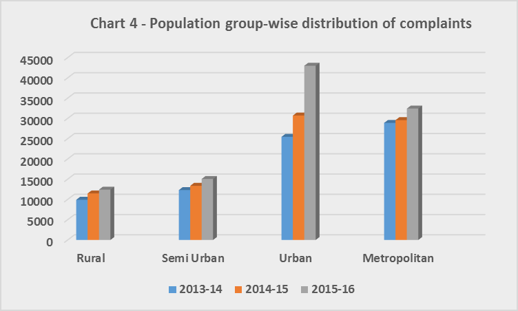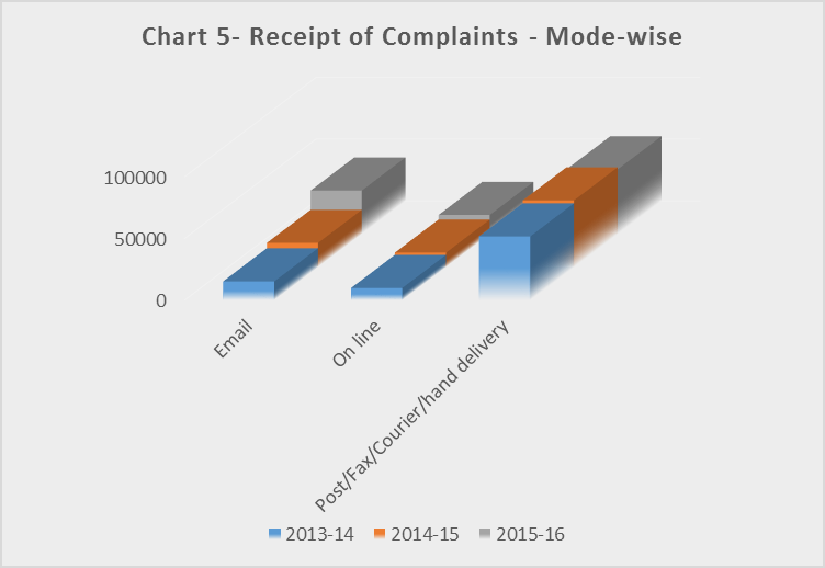 Groups with vested interest enticing the people to make frivolous/non-material complaints, at times with ulterior motives. Population group-wise distribution of complaints 2.4 Population group-wise distribution of complaints during the last three years is given in Table 4 and Chart 4. | Table 4 - Population group-wise distribution of complaints | | Population Group | No of complaints received during | % increase decrease (Year-on-year) | | 2013-14 | 2014-15 | 2015-16 | | Rural | 9927 (13%) | 11484 (13%) | 12420 (12%) | 8.2% | | Semi Urban | 12314 (16%) | 13363 (16%) | 15048 (15%) | 12.6% | | Urban | 25448 (33%) | 30710 (36%) | 42994 (42%) | 40% | | Metropolitan | 28884 (38%) | 29574 (35%) | 32432 (31%) | 9.7% | | Total | 76573 | 85131 | 102894 | | | (Figures in bracket indicate %age to total complaints of respective year) | The trend of urban centric receipt of complaints continue to remain the same. Urban and Metropolitan population are the major group of complainants under the BOS with 73% complaints from this strata. Year-on-year basis, Urban population group recorded phenomenal increase of 40% in complaints received. Complaints from Rural and Semi-urban population groups increased by 8.2% and 12.6% respectively, whereas in Metropolitan population group, complaints increased by 9.7%. Receipt of complaints - Mode-wise 2.5 A complaint can be lodged with the OBO by hand delivery, post, courier, fax or e-mail. It can also be lodged online from the complaint form placed on the website of RBI. Comparative position of complaints received through various modes during the last three years is indicated in Table 5 and Chart 5. | Table 5 – Receipt of complaints - Mode-wise | | Mode of Receipt | No. of Complaints received during | % change (Year-on-year) | | 2013-14 | 2014-15 | 2015-16 | | Email | 15181 (20%) | 19508 (23%) | 35169 (34%) | 80.3% | | On line | 9785 (13%) | 11634 (14%) | 15378 (15%) | 32.2% | | Post/Fax/Courier/hand delivery | 51607 (67%) | 53989 (63%) | 52347 (51%) | -3.04% | | Total | 76573 | 85131 | 102894 | | | (*Figures in bracket indicate %age to total complaints of respective years.) |
