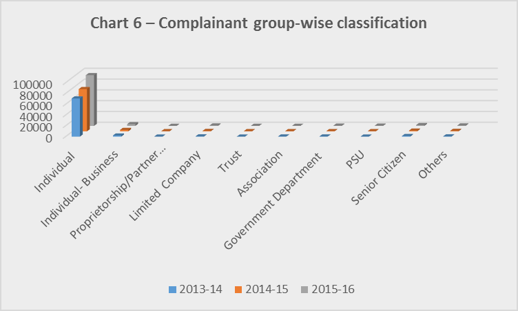 Though for lodging complaints with OBOs, the physical mode (Post/Fax/Courier/hand delivery) remained the dominant mode, it may be seen that over the years the share of physical mode in lodging of complaints is witnessing a downward trend. From 67% in 2013-14 it has come down to 51% in 2015-16. On year-on year basis, the proportion of complaints lodged through electronic mode (Email and Online) has increased by 62%. This is one of the major factors for increase in number of complaints received during 2015-16. Complainant group-wise classification 2.6 The main target group of the BOS is individual bank customers. During the year 93.06% complaints were received from individual customers including senior citizens. Break-up of complaints received from various segments of society is given in Table 6 and Chart 6. | Table 6 – Complainant group-wise classification | | | Complaints Received | | 2013-14 | 2014-15 | 2015-16 | | Individual | 70913 (92.6%) | 78353 (92%) | 94186 (91.54%) | | Individual- Business | 2163 (2.87%) | 2566 (3%) | 3312 (3.22%) | | Proprietorship/Partnership | 151 (0.2%) | 255 (0.3%) | 310 (0.3%) | | Limited Company | 510 (0.7%) | 699 (0.8%) | 936 (0.91%) | | Trust | 184 (0.2%) | 224 (0.3%) | 288 (0.28%) | | Association | 297 (0.4%) | 281 (0.3%) | 316 (0.31%) | | Government Department | 287 (0.4%) | 376 (0.4%) | 561 (0.54%) | | PSU | 266 (0.3%) | 234 (0.3%) | 524 (0.51%) | | Senior Citizen | 1229 (1.6%) | 1318 (1.55%) | 1569 (1.52%) | | Others | 573 (0.73%) | 825 (0.97%) | 892 (0.87%) | | Total | 76573 | 85131 | 102894 | | (*Figures in bracket indicate %age to total complaints of respective years.) |