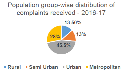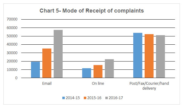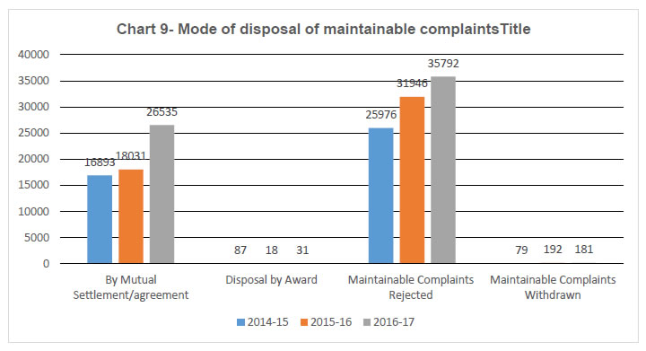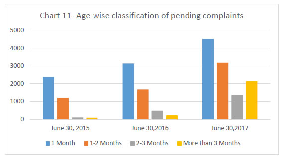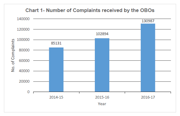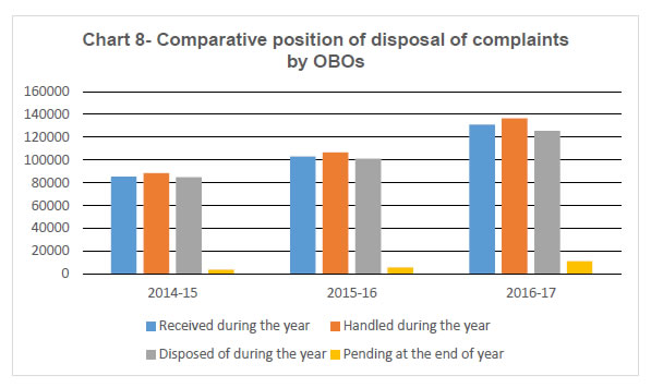 | Table 8 C - Breakup of Complaints in ';Others' Category | | Sub Category | 2014-15 | 2015-16 | 2016-17 | | i. Non adherence to RBI directives on : | | | | I. Banking or other services | 5318 (6.25%) | 4529 (4.4%) | 5202 (4%) | II. Interest rates (loans and advances) | 918 (1.08%) | 957 (0.9%) | 1051 (0.8%) | III. Any other direction or instruction as may be specified by the RBI on loans and advances | 7373 (8.66%) | 10401 (10.1%) | 13986 (10.7%) | | ii. Non Adherence to Prescribed Working Hours | 102 (0.12%) | 148 (0.1%) | 387 (0.3%) | | iii. Refusal to accept or delay in accepting payment towards taxes as required by RBI/Govt | 171 (0.20%) | 230 (0.2%) | 183 (0.1%) | | iv. Refusal to issue or delay in issuing or failure to service or delay in servicing or redemption of Government Securities | 75 (0.09%) | 101 (0.1%) | 210 (0.2%) | | v. Others | 525 (0.62%) | 622 (0.6%) | 2150 (1.6%) | | Sub-Total | 14482 (17.01%) | 16988 (16.5%) | 23169 (17.7%) | | Total No. of complaints received | 85131 | 102894 | 130987 | | (Figures in bracket indicate %age to total complaints of respective years) | 3.2 Failure to meet commitments /Non observance of fair practices code/BCSBI Codes accounting for 33.9% of total complaints remained the major category of complaints in the year 2016-17 as was the case in the previous two years. Training of the frontline staff on the Fair Practices Code of BCSBI, regulatory instructions, and monitoring by the Top Management will help to bring down the complaints under this category. 3.3 As reflected in the above table, there is a decline in the number in the credit card related complaints as well as their percentage share of these complaints. At the same time there is a perceptible rise in the number of ATM /debit card related complaints which increased by 12.5% during the year under review. Card related complaints (Debit and Credit) comprised 18.9% of total complaints and accounted for the second highest number of complaints. Out of a total of 24731 card related complaints, 16434 complaints pertained to ATM/Debit Cards (12.5% of total complaints received). Non-dispensation/short dispensation of cash in ATM withdrawals were the major causes of complaints under this category. Complaints related to Credit Cards constituted 6.4% of total complaints received during 2016-17. 3.4 Pension related complaints constituted 6.5% of the total complaints. Delayed payment, errors in calculations, difficulties in converting the pension to family pension on demise of pensioner, non-cooperation of staff etc. were the area of grievance under this category. 3.5 'Levy of charges without prior notice' comprised 5.5% of total complaints received. Levying charges for non-maintenance of minimum balance, processing fees, pre-payment penalties, cheque collection charges were some of the major reasons of complaints in this area. 3.6 Delay in credit, non-credit of proceeds to parties accounts, non-payment of deposit or non-observance of the RBI directives, if any, applicable to rate of interest on deposits in savings, current or other accounts maintained with a bank, etc., were the major reasons for complaints related to ‘Deposit Accounts’ which accounted for 5.5% of total complaints received. 3.7 Complaints on ‘loans and advances’ at 4.2 % of the complaints received mainly pertained to delay in sanction, disbursement, non observance of prescribed time schedule for disposal of loan applications and non-acceptance of application without valid reasons. 3.8 Non-payment or delay in payment of inward remittances, non-payment or inordinate delay in the payment or in the collections of collection of cheques, drafts, bills etc. were the major reasons for complaints received under the category of ‘Remittances’ which represented 2.5% of total complaints. 3.9 ‘Others’ category of complaints includes those pertaining to non-adherence with prescribed working hours, delay in providing banking facilities, refusal/delay in accepting payment towards taxes as required by RBI/Government, refusal/delay in issuing/servicing or redemption of government securities, non-adherence to RBI directives, etc. These complaints constituted 17.7% of the total complaints. 3.10 ‘Out of Subject’ is the category of complaints which are not on the grounds of complaints specified under Clause 8 of the BOS. 4.8% of the complaints received during the year fell under this category. 4. Disposal of Complaints 4.1 During the year OBOs handled 1,36,511 complaints, including 5,524 complaints pertaining to last year. As on June 30, 2017, OBOs managed to dispose 92% of the complaints handled during the year. Table 9 and Chart 8 below indicate a comparative position of disposal of complaints by OBOs. | Table 9 - Comparative position of disposal of complaints by OBOs | | Number of complaints | Year | | 2014-15 | 2015-16 | 2016-17 | | Received during the year | 85131 | 102894 | 130987 | | Brought forward from previous year | 3307 | 3778 | 5524 | | Handled during the year | 88438 | 106672 | 136511 | | Disposed of during the year | 84660 | 101148 | 125319 | | Rate of Disposal (%) | 96% | 95% | 92% | | Carried forward to the next year | 3778 | 5524 | 11192 | Compared to previous years, complaints increased by 11% in 2014-15, 21% in 2015-16 and 27 % in the year 2016-17. Although the rate of disposal declined from 95% to 92% during the year, the actual number of complaints handled increased by 28%. OBO wise position of complaints disposed during the year 2016-17 is indicated in Table 10 below: | Table 10 - OBO wise position of complaints disposed during 2016-17 | | OBO | Complaints pending at the beginning of the Year | Complaints Received during the Year | Complaints handled | Complaints Disposed | Pending at the end of the year | Rate of Disposal (%) | | Ahmedabad | 0 | 9552 | 9552 | 9552 | 0 | 100.00% | | Bengaluru | 131 | 7042 | 7173 | 7169 | 4 | 99.94% | | Bhopal | 216 | 5671 | 5887 | 5599 | 288 | 95.11% | | Bhubaneswar | 8 | 258