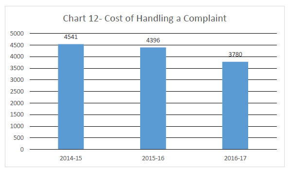 4.5. First Resort Complaints: Bank is the first touch point for the complainant for resolution of his grievance. Clause 9 (3) of the BOS stipulates that, '; No complaint to the Banking Ombudsman shall lie unless:- (a) the complainant had, before making a complaint to the Banking Ombudsman, made a written representation to the bank and the bank had rejected the complaint or the complainant had not received any reply within a period of one month after the bank received his representation or the complainant is not satisfied with the reply given to him by the bank';. In terms of this Clause the complainant must first approach his bank for redressal of his grievance. However, a large number of complainants approach the OBO without first approaching the bank. These complaints are termed First Resort Complaint (FRC) and returned to the complainant with suitable advice. However, a copy of the complaint is also forwarded to concerned bank for suitable resolution. 24% of the complaints received in the OBOs during the year were FRCs. FRCs received online through the complaint form placed on the website of RBI are directly forwarded to the concerned bank for suitable action. During the year, 20077 FRCs received through this mode were forwarded to the banks concerned. The software used in OBOs for processing of complaints has the facility to forward FRCs received in the OBO physical form, to concerned banks online by attaching scanned copy of the complaint. OBOs forwarded 3713 FRCs to concerned banks through this module during the year. Awards Issued 4.6 BOs issued 31 Awards during the year. Of these, 20 have been implemented as on June 30, 2017. Out of 11 Awards remaining unimplemented, in five cases, banks have preferred appeal before the Appellate Authority, two Awards have lapsed and four Awards remained unimplemented as on June 30, 2017. OBO-wise position of Awards issued during the year 2016-17 is indicated in Table 13 below: | Table 13 - OBO wise position of Awards issued during the year 2016-17 | | OBO | Awards Issued | | Ahmedabad | 0 | | Bengaluru | 2 | | Bhopal | 0 | | Bhubaneswar | 1 | | Chandigarh | 0 | | Chennai | 1 | | Guwahati | 0 | | Hyderabad | 0 | | Jaipur | 0 | | Kanpur | 17 | | Kolkata | 6 | | Mumbai | 0 | | New Delhi | 1 | | Patna | 1 | | Thiruvananthapuram | 0 | | New Delhi-II | 0 | | Dehradun | 2 | | Ranchi | 0 | | Raipur | 0 | | Jammu | 0 | | Total | 31 | Age –wise classification of pending complaints 4.7 Table 14 and Chart 11 below indicate age-wise classification of pending complaints. | Table 14 - Age-wise classification of pending complaints | | Pending up to | June 30, 2015 | June 30, 2016 | June 30, 2017 | | 1 Month | 2375 (2.69%) | 3136 (2.88%) | 4511 (3.10%) | | 1-2 Months | 1207 (1.36%) | 1675 (1.51%) | 3181 (2.35%) | | 2-3 Months | 105 (0.12%) | 481 (0.41%) | 1361 (1%) | | More than 3 Months | 91 (0.1%) | 232 (0.2%) | 2139 (1.55%) | | Total Pending | 3778 (4%) | 5524 (5%) | 11192 (8%) | | Complaints handled | 88438 | 106672 | 136511 | | (Figures in bracket indicate %age to complaints handled during respective years) | At the end of the year, 11,192 (8%) complaints were pending at all OBOs. Out of these, 3.10% complaints were pending for less than one month, 2.35% complaints were pending between one to two months, 1% complaints were pending between two to three months and 1.55% complaints were pending beyond three months. 5. Cost of Running the Scheme 5.1 The expenditure incurred on running the BOS is fully borne by the RBI from the year 2006. This includes revenue expenditure and capital expenditure incurred on administration of the BOS. The revenue expenditure includes establishment items like salary and allowances of the staff attached to OBOs and non-establishment items such as rent, taxes, insurance, law charges, postage and telegram charges, printing and stationery expenses, publicity expenses, depreciation and other miscellaneous items. The capital expenditure items include furniture, electrical installations, computers/related equipment, telecommunication equipment and motor vehicle. Average cost incurred for handling a complaint under the BOS 2006 is indicated in Table 15 and Chart 12. | Table 15 - Cost of handling a complaint | | | 2014-15 | 2015-16 | 2016-17 | | Total Cost (Rs. Million) | 387 | 452 | 495 | | Complaints Received | 85131 | 102894 | 130987 | | Average Cost of handling a Complaint (₹) | 4541 | 4396 | 3780 | The aggregate cost of running the BOS has increased from ₹ 452 million in 2015-16 to ₹ 495 million in 2016-17. The volume of complaints increased by 27.30% during this period, the average cost of handling a complaint has declined from ₹ 4396/- to ₹ 3780/-. BO Office wise 'Per-Complaint Cost’ for the year 2016-17 is given in Table 16 | Table 16 - OBO wise 'Per-Complaint Cost’ for the year 2016-17 | | OBO | Per Complaint Cost (₹) | | Ahmedabad | 4621 | | Bengaluru | 3139 | | Bhopal | 5208 | | Bhubaneswar | 8748 | | Chandigarh | 4349 | | Chennai | 3236 | | Guwahati | 5705 | | Hyderabad | 4766 | | Jaipur | 4277 | | Kanpur | 5737 | | Kolkata | 4984 | | Mumbai | 4157 | | New Delhi | 1690 | | Patna | 3280 | | Thiruvananthapuram | 5770 | | New Delhi-II | 2117 | | Dehradun | 5741 | | Ranchi | 6163 | | Raipur | 8649 | | Jammu | 91306 | 6. Appeals against the Decisions of the BOs 6.1 The BOS provides an option of appeal to both the parties in terms of Clause 14 of the BOS 2006. Any party aggrieved by an Award issued by the BO under clause 12 or by rejection of a complaint for the reasons referred to in sub clauses (d) to (g) of clause 13, can prefer an appeal before the Appellate Authority designated under the Scheme within 30 days of the date of receipt of communication of Award or rejection of complaint. The Deputy Governor-in-Charge of the Consumer Education and Protection Department is the designated Appellate Authority (AA). The secretarial assistance to the AA is provided by the Consumer Education and Protection Department (CEP