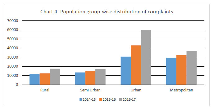 | | 9 | Clause 14 : Appeal before the Appellate Authority: (1) Any person aggrieved by an Award under clause 12 or rejection of a complaint for the reasons referred to in sub clauses (d) to (f) of clause 13, may within 30 days of the date of receipt of communication of Award or rejection of complaint, prefer an appeal before the Appellate Authority; | Clause 14 : Appeal before the Appellate Authority: (1) Party to the complaint aggrieved by an Award under Clause 12 or rejection of a complaint for the reasons referred in sub clauses (d) requiring consideration of elaborate documentary and oral evidence (e) without any sufficient cause (f) not pursued with reasonable diligence (g) no loss or damage or inconvenience caused to the complainant of Clause 13, may within 30 days of the date of receipt of communication of Award or rejection of complaint, prefer an appeal before the Appellate Authority; | The enlarged scope of the Scheme coupled with increased awareness among the common persons about it as a result of continuous publicity measures and outreach programmes initiated by RBI and the OBOs, have resulted in increasing the volume of complaints, from 38,000 in the year 2006-07 to 130,000 in 2016-17. The increasing volume of complaints combined with the need for enhancing the reach of the BO Scheme, the RBI, during 2016-17 opened new OBOs at Dehradun, Jammu, Raipur, Ranchi and additional OBO at New Delhi, taking the number of OBOs from 15 to 20. Revised areas of jurisdiction is given in the Annex I of this report. During the year, the twenty OBOs received 130987 complaints. A detailed analysis of the complaints handled by the OBOs during the year is given in the ensuing chapter. | Profile of customer complaints handled by OBOs | | Particulars | 2014-15 | 2015-16 | 2016-17 | | Complaints brought forward from previous year | 3,307 | 3,778 | 5,524 | | Complaints received | 85,131 | 102,894 | 130,987 | | Total No of complaints handled | 88,438 | 106,672 | 136,511 | | Complaints disposed | 84,660 | 101,148 | 125,319 | | Complaints pending at the end of the year | 3,778 (4%) | 5,524 (5%) | 11,192 (8%) | | Complaints Pending for less than one month | 2,375 (2.55%) | 3,136 (2.9%) | 4,511 (3.10%) | | Complaints Pending for one to two months | 1,207 (1.23%) | 1675 (1.5%) | 3,181 (2.35%) | | Complaints Pending for two to three months | 105 (0.12%) | 481 (0.4%) | 1,361 (1%) | | Complaints Pending for more than three months | 91 (0.1%) | 232 (0.2%) | 2,139 (1.55%) | | Appeals pending at beginning of the year | 30 | 15 | 3 | | Appeals received | 73 | 34 | 15 | | Total no. of Appeals handled | 103 | 49 | 18 | | Appeals Disposed | 88 | 46 | 11 | | Appeals pending at the end of the year | 15 | 3 | 7 | | Representations to review the decision of BOs | 810 | 855 | 835 | 2. Receipt of Complaints 2.1 Comparative position of complaints received by twenty offices of Banking Ombudsman (OBOs) during the last three years is given in Table 1, Chart 1. | Table 1 - Number of complaints received by OBOs | | | 2014-15 | 2015-16 | 2016-17 | | No. of OBOs | 15 | 15 | 20 | | Complaints received during the year | 85131 | 102894 | 130987 | Compared to previous year, complaints increased by 21% in 2015-16 and 27 % in the year 2016-17. Increasing awareness about the BO Scheme and increasing customer base dominated by young generation bank customers’ aware about their rights, are some of the reasons for increase in volume of complaints received in the OBOs. OBO-wise receipt of complaints 2.2 Comparative position of complaints received by OBOs during the last three years is given in Table 2 and Chart 2. | Table 2 - OBO-wise receipt of complaints | | OBO | No. of complaints received during | % change in 2016-17 over 2015-16 | % to total complaints | | 2014-15 | 2015-16 | 2016-17 | | Ahmadabad | 4,965 | 5,909 | 9,552 | 61.65% | 7.29% | | Bengaluru | 4,610 | 5,119 | 7,042 | 37.57% | 5.38% | | Bhopal | 5,451 | 5,748 | 5,671 | -1.34% | 4.33% | | Bhubaneswar | 2,448 | 3,050 | 2,582 | -15.34% | 1.97% | | Chandigarh | 3,131 | 4,571 | 8,189 | 79.15% | 6.25% | | Chennai | 8,285 | 8,645 | 9,007 | 4.19% | 6.88% | | Guwahati | 1,054 | 1,328 | 1,569 | 18.15% | 1.20% | | Hyderabad | 4,366 | 5,910 | 6,570 | 11.17% | 5.02% | | Jaipur | 4,088 | 4,664 | 6740 | 44.51% | 5.15% | | Kanpur | 8,818 | 9,621 | 8,150 | -15.29% | 6.22% | | Kolkata | 5,277 | 4,846 | 7,834 | 61.66% | 5.98% | | Mumbai | 10,446 | 12,333 | 16,299 | 32.16% | 12.44% | | New Delhi | 14,712 | 22,554 | 24,837 | 10.12% | 18.96% | | Patna | 4,456 | 5,003 | 6,225 | 24.43% | 4.75% | | Thiruvananthapuram | 3,024 | 3,593 | 3,855 | 7.29% | 2.94% | | New Delhi-II * | 0 | 0 | 4,935 | - | 3.77% | | Dehradun * | 0 | 0 | 948 | - | 0.72% | | Ranchi * | 0 | 0 | 715 | - | 0.55% | | Raipur* | 0 | 0 | 237 | - | 0.18% | | Jammu* | 0 | 0 | 30 | - | 0.02% | | Total | 85,131 | 102,894 | 130,987 | 27.30% | |  OBO New Delhi received the highest number of complaints (24837) with 19% of the total complaints received. Four metro centres OBOs viz. New Delhi I, Chennai, Kolkata, Mumbai and two non-metro centres viz. OBO Ahmedabad and Chandigarh put together, accounted for 58 % of the total complaints received. OBO Ahmedabad, Chandigarh and Kolkata recorded more than 50% increase in complaints received compared to previous year. Zone-wise distribution of complaints 2.3. Zone-wise distribution of complaints is shown in Table 3 and Chart 3. | Table 3 - Zone-wise distribution of complaints | | EASTERN ZONE | 2015-16 | 2016-17 | %change | | Bhubaneswar | 3050 | 2582 | -15.34% | | Guwahati | 1328 | 1569 | 18.15% | | Kolkata | 4846 | 7834 | 61.66% | | Patna | 5003 | 6225 | 24.43% | | Ranchi* | 0 | 715 | - | | | 14227 | 18925 | 33.02% | | NORTHERN ZONE | | Chandigarh | 4571 | 8189 | 79.15% | | Dehradun * | 0 | 948 | - | | Jaipur | 4664 | 6740 | 44.51% | | Jammu * | 0 | 30 | - | | Kanpur | 9621 | 8150 | -15.29% | | New Delhi | 22554 | 24837 | 10.12% | | New Delhi II * | 0 | 4935 | - | | | 41410 | 53829 | 29.99% | | S