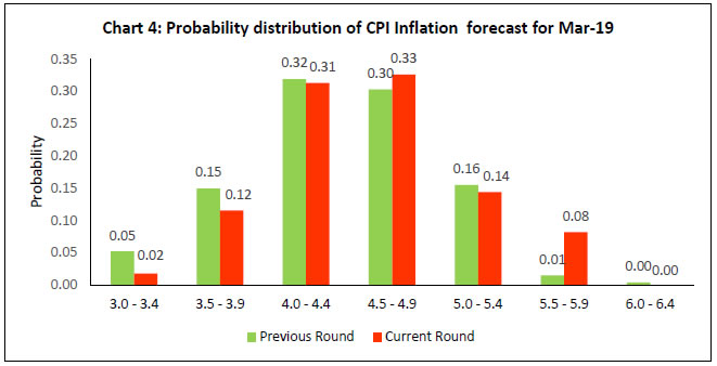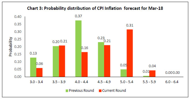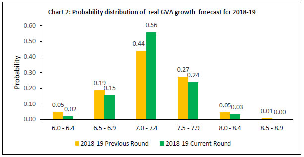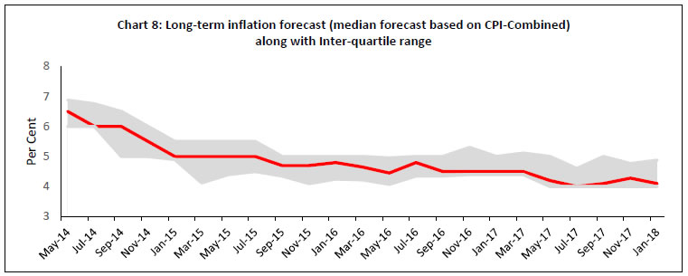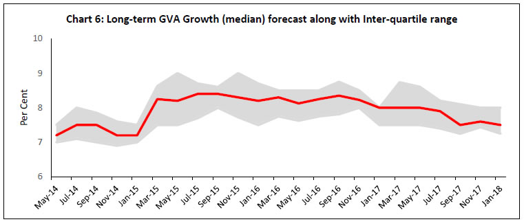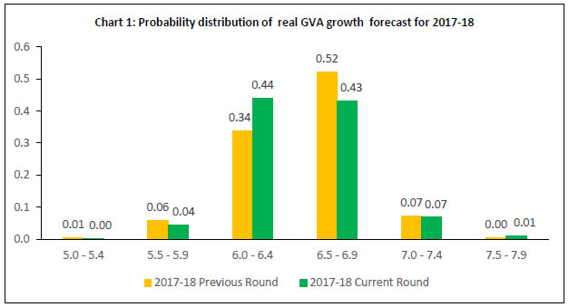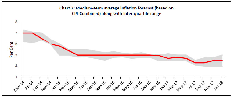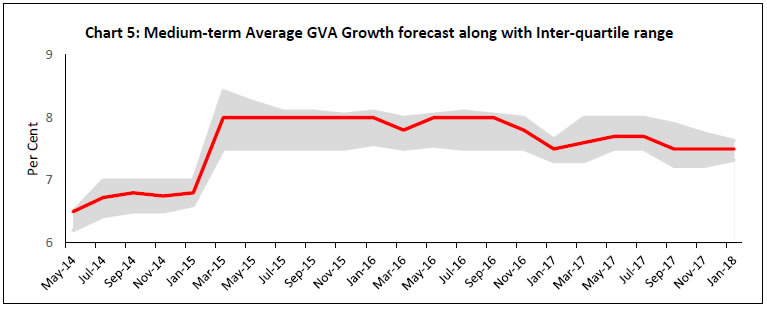 Growth is expected to moderate in 2017-18 and firm up in 2018-19 on the back of higher private consumption, according to the 30 forecasters surveyed by the Reserve Bank. Consumer Price inflation is expected to gradually rise to 5.5 per cent by Q1:2018-19. Today, the Reserve Bank released the results of the 50th round of the Survey of Professional Forecasters (SPF), which it has been conducting since September 2007. Thirty analysts participated in the January 20182 round of the survey. The results are summarised in terms of median forecasts (Annexes 1-8) and are available at the RBI website. Highlights: 1. Output • Real gross domestic product (GDP) and real gross value added (GVA) are likely to grow by 6.5 per cent and 6.1 per cent, respectively, in 2017-18 and rise further by 90 and 100 basis points (bps), respectively in 2018-19 on the back of support from private consumption (Table 1). • The saving rate is expected to improve in 2018-19 without, however, a commensurate upturn in the investment rate. | Table 1: Median Forecast of Growth in Real GDP, GVA and Components | | (in per cent) | | | 2017-18 | 2018-19 | | Real GDP Growth | 6.5 (-0.2) | 7.4 (-0.1) | | Real GVA Growth | 6.1 (-0.4) | 7.1 (-0.3) | | a. Agriculture and Allied Activities | 2.1 (-0.9) | 3.2 (+0.2) | | b. Industry | 4.6 (-0.1) | 6.5 (-0.3) | | c. Services | 7.6 (-0.5) | 8.3 (-0.1) | Private Final Consumption Expenditure (nominal) (growth rate in per cent) | 9.5 (-1.5) | 11.8 (-0.7) | Gross Saving Rate [per cent of gross national deposable income (GNDI)] | 30.9 (-0.1) | 31.5 (0.0) | Gross Fixed Capital Formation Rate (per cent of GDP) | 26.4 (-0.1) | 26.7 (-1.2) | | Note: In all the tables, figures in parentheses indicate the extent of revision in median forecasts (percentage points) relative to the previous SPF round. | • Forecasters have assigned the maximum probability to GVA growth being in the range of 6.0-6.4 per cent in 2017-18, as against the range of 6.5-6.9 per cent in the previous survey round (Chart 1). • For 2018-19, forecasters have assigned the highest probability to GVA growth being in the range of 7.0-7.4 per cent in this round; correspondingly, the probability of GVA growth being 7.5 per cent or more has been brought down (Chart 2). 2. Inflation • Headline consumer price index (CPI) inflation is expected to increase till Q1:2018-19 and moderate thereafter. Inflation forecasts have been revised up in the current round by 50-60 basis points from the previous round (Table 2). • CPI inflation excluding food and beverages, pan, tobacco and intoxicants, and fuel and light is likely to remain at around 5.0 per cent till Q3:2018-19. | Table 2: Median Forecast of Inflation | | (in per cent) | | | Q4:17-18 | Q1:18-19 | Q2:18-19 | Q3:18-19 | | CPI- Headline | 5.0 (+0.6) | 5.5 (+0.6) | 5.0 (+0.5) | 4.4 | | CPI excluding food & beverages, pan, tobacco & intoxicants and fuel & light | 4.9 (+0.1) | 5.3 (+0.1) | 5.3 (+0.4) | 4.9 | | WPI – All Commodities | 3.2 (+0.2) | 4.0 (+0.3) | 4.2 (+0.3) | 3.3 | | WPI – Non-food Manufactured Products | 2.7 (0.0) | 2.8 (0.0) | 2.9 (-0.2) | 2.4 | • Forecasters have assigned the highest probability to CPI inflation being in the range of 5.0-5.4 per cent in March 2018, with the distribution shifting to the right as compared with the previous round of the survey (Chart 3). • For March 2019, forecasters assigned the highest probability to CPI inflation in the range of 4.5-4.9 per cent (Chart 4). 3. External Sector • Forecasts of exports and imports during 2017-18 have been revised upwards from the last survey round; however, both export and import growth are likely to moderate in 2018-19 (Table 3). • The current account deficit (CAD) is expected to remain stable at around 1.7 per cent of GDP in 2017-18 and increase to 1.9 per cent in 2018-19. • The Indian rupee is likely to remain range-bound against the US dollar during the next four quarters (Annex 3). | Table 3: Median Forecast of Select External Sector Variables | | | 2017-18 | 2018-19 | Merchandise Exports: in US $ terms (annual growth in per cent) | 9.5 (+1.6) | 8.3 (+0.8) | Merchandise Imports: in US $ terms (annual growth in per cent) | 16.4 (+3.4) | 9.2 (+1.6) | Current Account Deficit (Ratio to GDP at current market prices, in per cent) | 1.7 (+0.1) | 1.9 (+0.2) | 4. Medium-term and Long-term Forecasts • The medium-term (five-year average) real GVA growth forecast remained unchanged from the last survey round at 7.5 per cent (Chart 5), while the long-term (ten-year average) real GVA growth forecast moderated by 10 bps to 7.5 per cent (Chart 6). • Average CPI headline inflation in the medium-term and the long-term are expected to be around 4.5 and 4.1 per cent, respectively, with the latter having been revised downwards by 20 bps, respectively, from the previous round of the survey (Charts 7 and 8).   The Reserve Bank thanks the following institutions for their participation in this round of the Survey of Professional Forecasters (SPF): Aditi Nayar, ICRA Limited; Anubhuti Sahay, Standard chartered bank; Debopam Chaudhuri, Piramal Enterprises Limited; Dun & Bradstreet; Gaurav Kapur, IndusInd Bank Ltd.; ICICI Securities Primary Dealership; Indranil Pan, IDFC bank; Nikhil Gupta, Motilal Oswal Securities Ltd.; PHD Research Bureau; Sameer Narang, Bank of Baroda; Shailesh Kejariwal, B&K Securities India Pvt Ltd; Siddharth V Kothari, Sunidhi Securities & Finance Ltd; Sumedh Deorukhkar, BBVA Hong Kong; and Upasna Bhardwaj, Kotak Mahindra Bank. The Bank also acknowledges the contribution of 12 others SPF panellists, who prefer to remain anonymous. | | Annex 1: Annual Forecasts for 2017-18 | | | Key Macroeconomic Indicators | Annual Forecasts for 2017-18 | | Mean | Median | Max | Min | 1st quartile | 3rd quartile | | 1 | GDP at constant (2011-12) prices: Annual Growth (per cent) | 6.5 | 6.5 | 6.8 | 6.4 | 6.5 | 6.6 | | 2 | GVA at basic prices at constant (2011-12) prices: Annual Growth rate (per cent) | 6.2 |