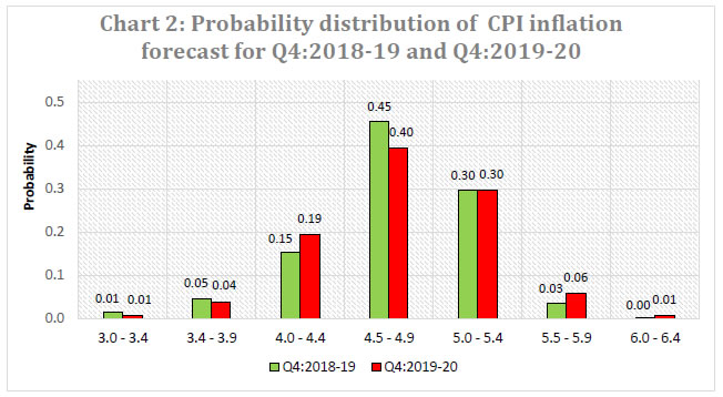 Growth is expected to firm up in 2018-19 and 2019-20 on the back of higher private consumption and investment. Consumer price inflation is expected to remain above 4.0 per cent from Q2:2018-19 to Q4:2018-19. The Reserve Bank has been conducting the Survey of Professional Forecasters (SPF) since September 2007. Twenty-five panellists participated in the 53rd round of the survey conducted during July 20182. The survey results are summarised in terms of their median forecasts and consolidated in Annexes 1-8, along with quarterly paths for key variables. Highlights: 1. Output • Real gross domestic product (GDP) is likely to grow at 7.4 per cent in 2018-19 ― up from 6.7 per cent in 2017-18 ― and is expected to accelerate further i.e., by 20 basis points (bps) in 2019-20 on the back of support from private consumption and investment (Table 1). • The investment rate, proxied by gross fixed capital formation, is expected to improve in 2018-19 and further in 2019-20, commensurate with an upturn in the saving rate. • Real gross value added (GVA) is expected to grow by 7.2 per cent in 2018-19 and by 7.4 per cent in 2019-20, supported by activity in the industrial and services sectors. | Table 1: Median Forecast of Growth in Real GDP, GVA and Components | | (in per cent) | | | 2018-19 | 2019-20 | | Real GDP Growth | 7.4 (0.0) | 7.6 (0.0) | Private Final Consumption Expenditure (nominal) (growth rate in per cent) | 11.6 (+0.6) | 11.8 (+0.5) | Gross Fixed Capital Formation Rate (per cent of GDP) | 29.0 (0.0) | 29.5 (+0.3) | | Real GVA Growth | 7.2 (+0.1) | 7.4 (0.0) | | a. Agriculture and Allied Activities | 3.4 (+0.4) | 3.0 (0.0) | | b. Industry | 6.9 (+0.1) | 7.0 (+0.2) | | c. Services | 8.2 (-0.1) | 8.6 (0.0) | Gross Saving Rate [per cent of gross national deposable income (GNDI)] | 30.0 (0.0) | 30.5 (0.0) | | Note: In all the tables, the figures in parentheses indicate the extent of revision in median forecasts (percentage points) relative to the previous SPF round. | • Forecasters have assigned the maximum probability to GDP growth being in the range of 7.0-7.4 per cent in 2018-19 and 7.5-7.9 per cent in 2019-20 (Chart 1). 2. Inflation • Headline consumer price index (CPI) inflation is likely to remain above 4.0 per cent till Q1:2019-20. • Core inflation (i.e., CPI excluding food and beverages, pan, tobacco and intoxicants, and fuel and light) is likely to remain above 5.0 per cent during 2018-19. | Table 2: Median Forecast of Quarterly Inflation | | (in per cent) | | | Q2:18-19 | Q3:18-19 | Q4:18-19 | Q1:19-20 | | CPI Headline | 4.7 (-0.2) | 4.3 (-0.1) | 4.8 (+0.2) | 5.1 | | CPI excluding food & beverages, pan, tobacco & intoxicants and fuel & light | 6.1 (+0.2) | 5.6 (+0.1) | 5.3 (+0.1) | 4.9 | | WPI All Commodities | 5.1 (+0.8) | 4.3 (+0.7) | 4.2 (+1.0) | 4.0 | | WPI Non-food Manufactured Products | 4.9 (+0.9) | 4.5 (+1.1) | 4.0 (+1.6) | 2.6 | • Forecasters have assigned the highest probability to CPI inflation being in the range 4.5-4.9 per cent in Q4:2018-19 as well as in Q4:2019-20 (Chart 2). 3. External Sector • The forecast of growth in merchandise exports and merchandise imports during 2018-19 have been revised up significantly to 9.8 per cent and 13.0 per cent, respectively, but some deceleration is expected in 2019-20 (Table 3). • The current account deficit (CAD) is expected to remain at around 2.5 per cent of GDP in 2018-19 and 2019-20. • The Indian rupee is likely to remain stable against the US dollar till Q4:2018-19 (Annex 3). | Table 3: Median Forecast of Select External Sector Variables | | | 2018-19 | 2019-20 | Merchandise Exports – in US $ terms (annual growth in per cent) | 9.8 (+1.7) | 8.4 (0.0) | Merchandise Imports– in US $ terms (annual growth in per cent) | 13.0 (+0.5) | 8.6 (+0.1) | Current Account Deficit (Ratio to GDP at current market price, in per cent) | 2.5 (+0.1) | 2.5 (+0.1) | The Reserve Bank thanks the following institutions for their participation in this round of the Survey of Professional Forecasters (SPF): Aditi Nayar, ICRA Limited; Anubhuti Sahay, Standard Chartered Bank; CRISIL Ltd; Debopam Chaudhuri, Piramal Enterprises Limited; Gaurav Kapur, IndusInd Bank Ltd.; ICICI Securities PD; Indranil Pan, IDFC Bank Ltd.; Nikhil Gupta, Motilal Oswal; Pinaki M. Mukherjee, Maruti Suzuki; Sameer Narang, Bank of Baroda; Shailesh Kejariwal, B&K Securities India Pvt Ltd; and Siddharth V Kothari, Sunidhi Securities & Finance Ltd. The Bank also acknowledges the contribution of 13 others SPF panellists, who prefer to remain anonymous. | | Annex 1: Annual Forecasts for 2018-19 | | Key Macroeconomic Indicators | Annual Forecasts for 2018-19 | | Mean | Median | Max | Min | 1st quartile | 3rd quartile | | 1 | GDP at constant (2011-12) prices: Annual Growth (per cent) | 7.3 | 7.4 | 7.8 | 6.9 | 7.2 | 7.5 | | 2 | Private Final Consumption Expenditure (PFCE) at current prices: Annual Growth (per cent) | 11.4 | 11.6 | 12.3 | 10.3 | 10.7 | 12.0 | | 3 | Gross Fixed Capital Formation (GFCF) Rate (per cent of GDP at current market prices) | 28.9 | 29.0 | 30.0 | 26.5 | 28.9 | 29.4 | | 4 | GVA at basic prices at constant (2011-12) prices: Annual Growth rate (per cent) | 7.2 | 7.2 | 7.7 | 6.7 | 7.0 | 7.3 | | a | Agriculture & Allied Activities (growth rate in per cent) | 3.5 | 3.4 | 4.4 | 2.8 | 3.0 | 4.0 | | b | Industry (growth rate in per cent) | 7.0 | 6.9 | 8.1 | 4.9 | 6.4 | 7.6 | | c | Services (growth rate in per cent) | 8.2 | 8.2 | 9.1 | 7.3 | 7.8 | 8.4 | | 5 | Gross Saving Rate (per cent of Gross National Disposable Income) - at current prices | 29.7 | 30.0 | 32.1 | 27.7 | 28.7 | 30.1 | | 6 | Fiscal Deficit of Central Govt. (per cent of GDP at current market prices) | 3.4 | 3.3 | 3.7 | 3.2 | 3.3 | 3.5 | | 7 | Combined Gross Fiscal Deficit (per cent to GDP) | 6.1 | 6.1 | 6.6 | 5.7 | 6.0 | 6.3 | | 8 | Bank Credit - Scheduled commercial banks: Annual Growth (per cent) | 11.1 | 11.3 | 15.0 | 8.0 | 9.8 | 12.0 | | 9 | Yield on 10-Year G-Sec of Central Govt. (