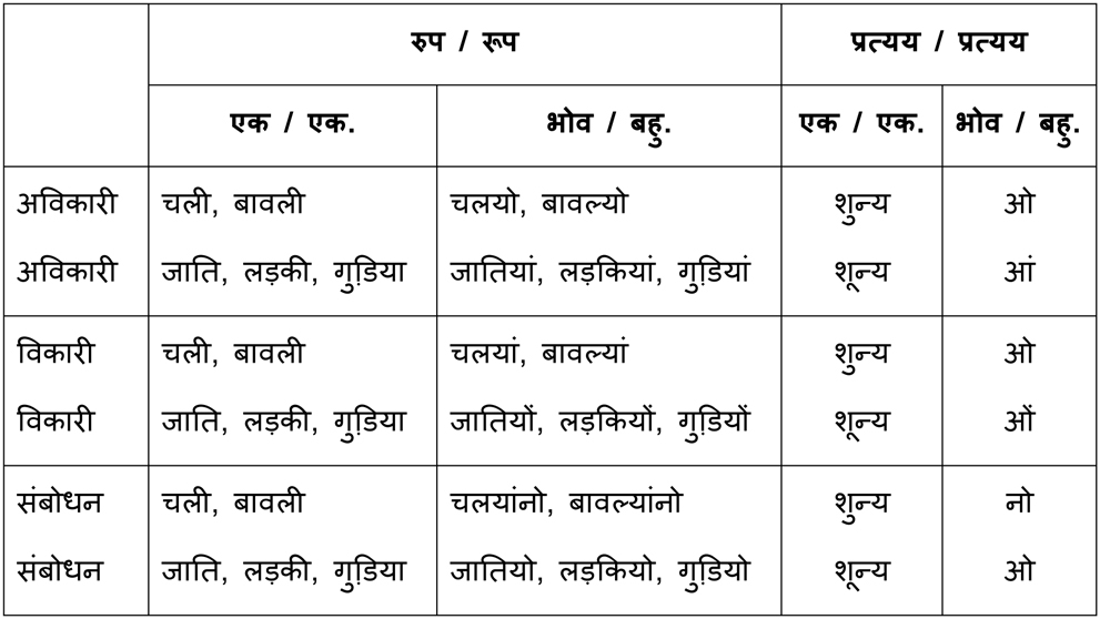 देखीक: कोंबी, आजी, चली, मामी, बी / जैसेः नदी, चिट्ठी, टोपी, रोटी, गाली, विनती। आडवाद: दुदी, मुनी, रुची / अपवाद: पानी, घी, दही, मोती। - - / ऊनवाचक संज्ञाएं: खटिया, डिबिया, पुड़िया।