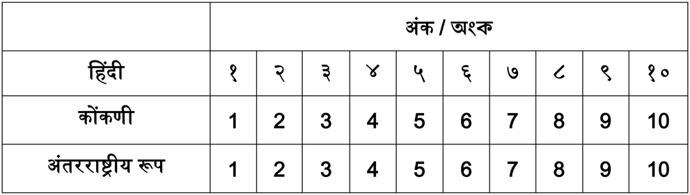 1.18 आंकडे / अंक 1.19 आंकडे मेजणी / संख्या गिनती | हिंदी | कोंकणी | कोंकणी उच्चार | | एक | एक | EK | | दो | दोन | Do | | तीन | तीन | teen | | चार | चार | Chaar | | पाँच | पांच | Paanch | | छह | स | So | | सात | सात | Saat | | आठ | आठ | AaTh | | नौ | णव | Nav | | दस | धा | Dha | | ग्यारह | इकरा | Ikraa | | बारह | बारा | Bara | | तेरह | तेरा | tera | | चौदह | चवदा | Chouda | | पंद्रह | पंदरा | Pandra | | सोलह | सोळा | Sola | | सत्रह | सतरा | Satra | | अठारह | अठरा | Athara | | उन्नीस | एकुणीस | Unnees | | बीस | वीस | Bees | | इक्कीस | एकवीस | Ekunis | | बाईस | बावीस | Baaees | | तेईस | तेवीस | Teies | | चौबीस | चोवीस | Choubees | | पच्चीस | पंचवीस | Pachees | | छब्बीस | सव्वीस | Chhabbees | | सत्ताईस | सत्तावीस | Sattaees | | अठाईस | अठठावीस | AThaaees | | उन्तीस | एकुणतीस | Untees | | तीस | तीस | tees | | इकतीस | एकतीस | Ikatees | | बत्तीस | बत्तीस | Battees | | तैंतीस | तेत्तीस | Taintees | | चौंतीस | चवतीस | Chountees | | पैंतीस | पस्तीस | Paintees | | छत्तीस | छ्त्तीस | Chattees | | सैंतीस | सात्तीस | Saintees | | अड़तीस | आठठीस | Artees | | उन्चालीस | एकुणचाळीस | Unchaalees | | चालीस | चाळीस | Chaalees | | इकतालीस | एकेचाळीस | Iktaalees | | बयालीस | बेचाळीस | Bayaalees | | तैंतालीस | तेवेचाळीस | tevechalis | | चौवालीस | चवेचाळीस | Chouvaalees | | पैंतालीस | पंचेचाळीस | Paintaalees | | छियालीस | शेचाळीस | Chhiyaalees | | सैंतालीस | सत्तेचाळीस | Saintaalees | | अड़तालीस | अठठेचाळीस | Adtaalees | | उनचास | एकुणन्नास | Unchaas | | पचास | पन्नास | Pachaas | | इक्यावन | एकावन | Ikyaawan | | बावन | बावन | Baawan | | तिरपन | त्रेप्पन | Tirpan | | चौवन | चवपन | Chouvan | | पचपन | पंचावन | Pachpan | | छप्पन | छाप्पन | Chhappan | | संतावन | सत्तावन | Santaavan | | अट्ठावन | अठठावन | ATThavan | | उनसठ | एकुणसाठ | UnsaTh | | साठ | साठ | SaTh | | इकसठ | एकसठ | IksaTh | | बासठ | बासठ | BaasaTh | | तिरसठ | त्रेसठ | TresaTh | | चौंसठ | चवसठ | ChousaTh | | पैंसठ | पांसठ | PainsaTh | | छियासठ | सांसठ | ChhiyasaTh | | सड़सठ | सातसठ | SadsaTh | | अड़सठ | आठसठ | AthsaTh | | उनहत्तर | एकुणसत्तर | Unhattar | | सत्तर | सत्तर | Sattar | | इकहत्तर | एक्यात्तर | Ikhattar | | बहत्तर | ब्यात्तर | Byattar | | तिहत्तर | त्र्यात्तर | Tihattar | | चौहत्तर | चवद्यात्तर | Chouhattar | | पचहत्तर | पंच्यात्तर | Pachhattar | | छिहत्तर | शात्तर | Chihattar | | सतहत्तर | सत्त्यात्तर | Sathattar | | अठहत्तर | अठठ्यात्तर | Athhattar | | उन्नासी | एकुणअंयशीं | Unnasee | | अस्सी | अंयशीं | Assee | | इक्यासी | एक्यांयशीं | Ikyasee | | बयासी | ब्यांयशीं | Bayaasee | | तिरासी | त्र्यांयशीं | Tirasee | | चौरासी | चवद्यांयशीं | Chourasee | | पचासी | पंच्यायशीं | Pachasee | | छियासी | शांयशीं | Chiyasee | | सतासी | सत्त्यांयशीं | Sataasee | | अठासी | अठठ्यांयशीं | Athaasee | | नवासी | एकुणणव्वद | Navaasee | | नब्बे | णव्वद | Nabbe | | इक्यानवे | एक्याण्णव | Ekyaanav | | बानवे | ब्याण्णव | Baanve | | तिरानवे | त्र्याण्णव | Tiraanve | | चौरानवे | चवद्याण्णव | Chouranve | | पंचानवे | पंच्याण्णव | Panchaanve | | छियानवे | शाण्णव | Chhiyaanve | | सत्तानवे | सत्त्याण्णव | Sattanve | | अट्ठानवे | अठठयाण्णव | Atthaanve | | निन्यानवे | णव्याण्णव | Ninyaanve | | एक सौ | शंबर | Ek sou | | हजार | हजार | Hajaar | | लाख | लाख | Laakh | | करोड़ | कोटी | Karod |