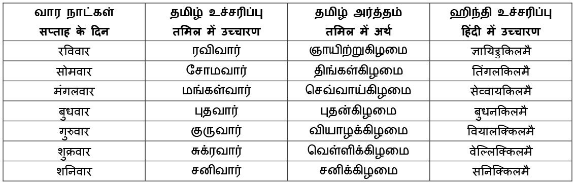 நேரம் – மணி – நாள் (नेरम – मणि – नाल) | समय/घंटे/दिन | Time/Hour/Day |