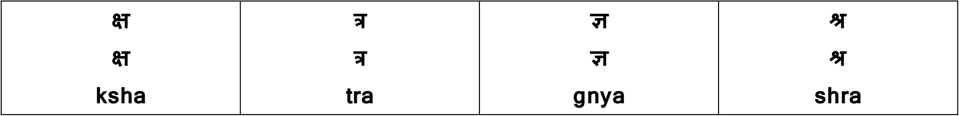 | असमान जोडाक्षर / असमान संयुक्ताक्षर | | जोडाक्षर / संयुक्ताक्षर | हिंदी शब्द | मराठी अर्थ | हिंदी उच्चार / हिंदी में उच्चारण | | क् + त = क्त | भक्त | भक्त | bhakt | | ख् + त = ख्त | सख्त | सक्त | sakht | | ग् + घ = ग्घ | बग्घी | बग्गी | bagghee | | च् + छ = च्छ | मच्छर | डास | machchhar | | ज् + ञ = ज्ञ | ज्ञान | ज्ञान | gnyaan | | ट् + ट = ट्ट | पट्टी | पट्टी | pattee | | ट् + ठ = ट्ठ | गट्ठर | गट्ठा | gaTThar | | त् + थ = त्थ | कत्था | कात | kattha | | द् + ध – द्ध | शुद्ध | शुद्ध | shuddha | | द् + भ = द्भ | उद्भव | उद्भव | Udbhav | | द् + व – द्व | द्वार | द्वार | dwaar | | ध् + व – ध्व | ध्वज | ध्वज | dhvaj | | न् + त = न्त | अंत | अंत | Ant | | न् + थ = न्थ | ग्रंथ | ग्रंथ | granth | | न् + द = न्द | बंद | बंद | band | | न् + ध = न्ध | सुगंध | सुगंध | sugandh | | न् + य = न्य | सन्यासी | सन्यासी | sanyasee | | प् + त = प्त | समाप्त | समाप्त | samaapt | | फ् + त – फ्त | दफ्तर | कचेरी | daphtar | | ब् + द = ब्द | शब्द | शब्द | shabd | | म् + त = म्त | सम्मत | सम्मत | sammat | | म् + प = म्प | भूकंप | भूकंप | bhookamp | | म् + ब = म्ब | लंबा | लांब | lambaa | | म् + भ = म्भ | संभव | संभव | sambhav | | र् + ज = र्ज | गर्जन | गर्जन | garjan | | र् + च = र्च | अर्चन | अर्चन | Archan | | र् + क = र्क | तर्क | तर्क | tark | | र् + च = र्च | खर्च | खर्च | kharch | | र् + ल = र्ल | दुर्लभ | दुर्लभ | durlabh | | र् + श = र्श | स्पर्श | स्पर्श | sparsh | | र् + ष = र्ष | हर्ष | हर्ष | harSh | | ल् + क = ल्क | शुल्क | शुल्क | shulk | | ल् + प = ल्प | विकल्प | विकल्प | vikalp | | श् + च = श्च | निश्चय | निश्चय | nishchay | | श् + छ = श्छ | निश्छल | निश्छल | nishchhal | | ष् + क = ष्क | शुष्क | शुष्क | shuShk | | ष् + ट = ष्ट | कष्ट | कष्ट | kaShT | | ष् + प – ष्प | पुष्प | पुष्प | puShpa | | स् + ख = स्ख | स्खलन | स्खलन | skhalan | | स्+प – स्प | स्पंदन | स्पंदन | spandan | | स्+फ – स्फ | स्फूर्ति | स्फूर्ती | sphoorti | | स् + म – स्म | स्मारक | स्मारक | smaarak | | ण् + ड = ण्ड | पिंड | पिंड | piND | | ञ + च = ञ्च | पंचम | पंचम | peyncham | | ङ् + क = ङ्क | बैंक | बैंक | bangk | | ङ् + ख = ङ्ख | शंख | शंख | shangkh | | ङ् + ग = ङ्ग | गंगा | गंगा | ganggaa | | ङ् + घ = ङ्घ | संघ | संघ | sanggh | | ञ् + च = ञ्च | मंच | मंच | maeynch | | स् + थ् + य = स्थ्य | स्वास्थ्य | स्वास्थ्य | swaasthya | | ञ् + छ = ञ्छ | पूंछ | पूंछ | pooeynchh | | ञ् + ज = ञ्ज | रंजिश | रंजिश | raeynjish | | ण् + ट = ण्ट | ऊंट | उंट | OoNT | | ण् + ठ = ण्ठ | कंठ | कंठ | kaNTh | | ण् + ड – ण्ड | थंड | थंड | thaND | | क् + ष् + म = क्ष्म | लक्ष्मण | लक्ष्मण | lakShmaN | | र् + ज + उ = र्जु | अर्जुन | अर्जुन | Arjun | | ज् + ज् + व = ज्ज्व | उज्ज्वल | उज्ज्वल | Ujjval | | ष् + प् + र + आ = ष्प्रा | दुष्प्राप्य | दुष्प्राप्य | duShpraapya |