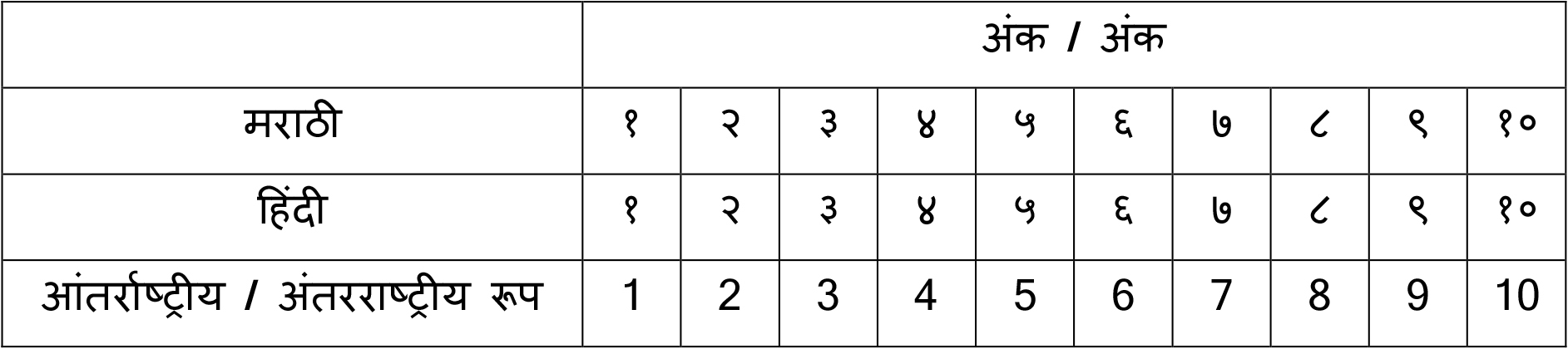 1.18 अंक / अंक 1.19 संख्या गणना / संख्या गिनती | हिंदी | मराठी | हिंदी उच्चार / हिंदी में उच्चारण | | एक | एक | Ek | | दो | दोन | Do | | तीन | तीन | teen | | चार | चार | chaar | | पाँच | पाच | paanch | | छह | सहा | chhah | | सात | सात | saat | | आठ | आठ | AaTh | | नौ | नऊ | Nau | | दस | दहा | Das | | ग्यारह | अकरा | gyaarah | | बारह | बारा | baarah | | तेरह | तेरा | terah | | चौदह | चौदा | choudah | | पंद्रह | पंधरा | pandrah | | सोलह | सोळा | solah | | सत्रह | सतरा | satrah | | अठारह | अठरा | ATharah | | उन्नीस | एकोणीस | unnees | | बीस | वीस | bees | | इक्कीस | एकवीस | Ikkees | | बाईस | बावीस | BaaEes | | तेईस | तेवीस | TeEes | | चौबीस | चोवीस | Choubees | | पच्चीस | पंचवीस | pachchees | | छब्बीस | सव्वीस | chhabbees | | सत्ताईस | सत्तावीस | sattaees | | अठ्ठाईस | अट्ठावीस | AThaaEes | | उनतीस | एकोणतीस | untees | | तीस | तीस | tees | | इकतीस | एकतीस | Ikatees | | बत्तीस | बत्तीस | Battees | | तैंतीस | तेहतीस | Taintees | | चौंतीस | चौतीस | chountees | | पैंतीस | पस्तीस | paintees | | छत्तीस | छत्तीस | chhattees | | सैंतीस | सदतीस | saintees | | अड़तीस | अडतीस | Aratees | | उनतालीस | एकोणचाळीस | unchaalees | | चालीस | चाळीस | chaalees | | इकतालीस | एकेचाळीस | iktaalees | | बयालीस | बेचाळीस | bayaalees | | तैंतालीस | त्रेचाळीस | taintaalees | | चौवालीस | चव्वेचाळीस | chauvaalees | | पैंतालीस | पंचेचाळीस | paintaalees | | छियालीस | सेहेचाळीस | chhiyaalees | | सैंतालीस | सत्तेचाळीस | saintaalees | | अड़तालीस | अठ्ठेचाळीस | ADataalees | | उनचास | एकोणपन्नास | unchaas | | पचास | पन्नास | pachaas | | इक्यावन | एक्कावन | Ikyaawan | | बावन | बावन | baawan | | तिरपन | त्रेपन | tirpan | | चौवन | चोपन | chouvan | | पचपन | पंचावन | pachpan | | छप्पन | छप्पन | chhappan | | सतावन | सत्तावन | Santaavan | | अट्ठावन | अठ्ठावन | ATThaavan | | उनसठ | एकोणसाठ | UnsaTh | | साठ | साठ | SaaTh | | इकसठ | एकसष्ठ | IksaTh | | बासठ | बासष्ठ | baasaTh | | तिरसठ | त्रेसष्ठ | tirsaTh | | चौंसठ | चौसष्ठ | chousaTh | | पैंसठ | पासष्ठ | painsaTh | | छियासठ | सहासष्ठ | chhiyasaTh | | सड़सठ | सदुसष्ठ | saDasaTh | | अड़सठ | अडुसष्ठ | AdasaTh | | उनहत्तर | एकोणसत्तर | Unahattar | | सत्तर | सत्तर | sattar | | इकहत्तर | एक्काहत्तर | ikahattar | | बहत्तर | बाहत्तर | bahattar | | तिहत्तर | त्र्याहत्तर | tihattar | | चौहत्तर | चौऱ्याहत्तर | chouhattar | | पचहत्तर | पंचाहत्तर | pachahattar | | छिहत्तर | शहाहत्तर | chhihattar | | सतहत्तर | सत्त्याहत्तर | satahattar | | अठहत्तर | अठ्ठ्याहत्तर | Athahattar | | उनासी | एकोणऐंशी | Unnaasee | | अस्सी | ऐंशी | Assee | | इक्यासी | एक्याऐंशी | ikyasee | | बयासी | ब्याऐंशी | bayaasee | | तिरासी | त्र्याऐंशी | tirasee | | चौरासी | चौऱ्याऐंशी | chourasee | | पचासी | पंचाऐंशी | pachasee | | छियासी | शहाऐंशी | chiyasee | | सतासी | सत्याऐंशी | sataasee | | अठासी | अठ्ठ्याऐंशी | Athaasee | | नवासी | एकोणनव्वद | navaasee | | नब्बे | नव्वद | nabbe | | इक्यानवे | एक्याण्णव | ikyaanve | | बानवे | ब्याण्णव | baanve | | तिरानवे | त्र्याण्णव | tiraanve | | चौरानवे | चौऱ्याण्णव | chouranve | | पंचानवे | पंचाण्णव | panchaanve | | छियानवे | शहाण्णव | chhiyaanve | | सत्तानवे | सत्त्याण्णव | sattanve | | अट्ठानवे | अठ्ठ्याण्णव | Atthaanve | | निन्यानवे | नव्याण्णव | ninyaanve | | सौ | शंभर | sau | | एक सौ | एकशे | Ek sou | | हजार | हजार | hajaar | | लाख | लाख | laakh | | करोड़ | करोड | karod |
