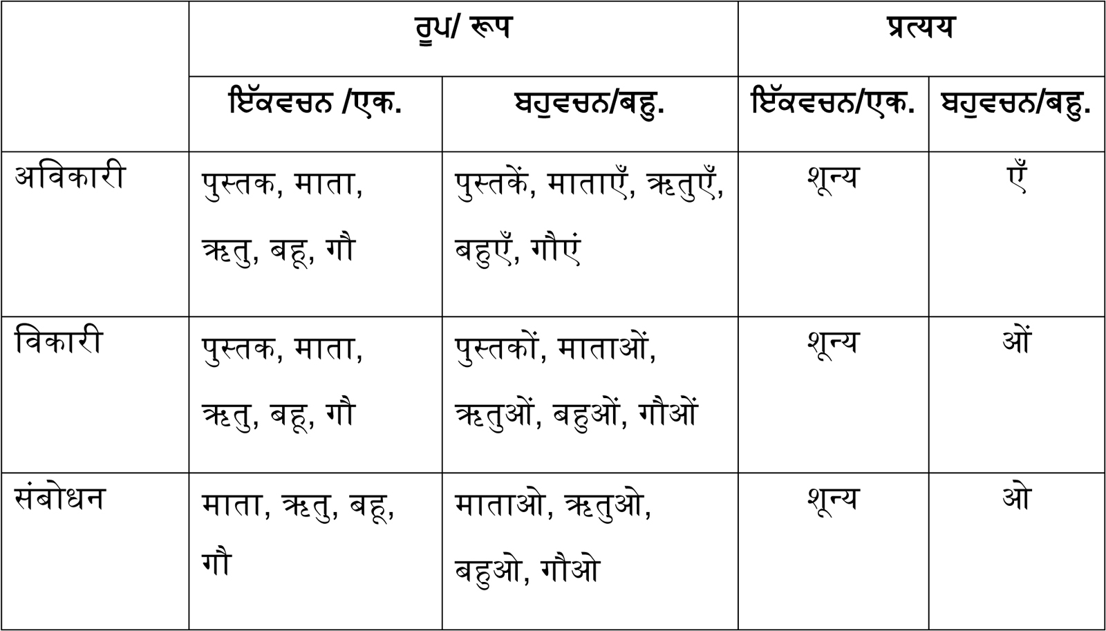 ਨੋਟ: ਧਿਆਨ ਰੱਖੋ ਕਿ ‘आ’(ਆ)ਤੋਂ ਅੰਤ ਹੋਣ ਵਾਲੇ ਪੁੱਲਿੰਗ ਸ਼ਬਦਾਂ ਦਾ ਵਚਨ ਬਦਲਣ ਲਈ आ’(ਆ)ਨੂੰ ‘ਈ’ ਵਿਚ ਬਦਲ ਦਿੱਤਾ ਜਾੰਦਾ ਹੈ। ਹੋਰ ਪੁੱਲਿੰਗ ਸ਼ਬਦਾਂ ਵਿਚ ਇਹੋ ਜਿਹਾ ਕੋਈ ਬਦਲਾਵ ਨਹੀ ਕੀਤਾ ਜਾੰਦਾ ।