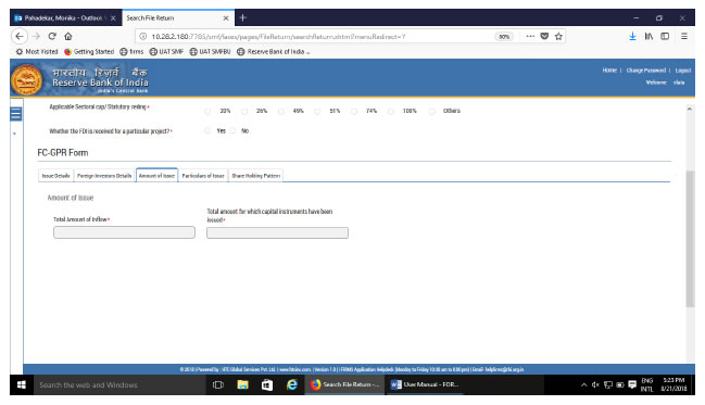 | Field name | Description | | Total amount of inflow | Auto-populated from tab 2 for all foreign investors | | Total amount for which capital instruments have been issued | Auto-populated from tab 2 for all foreign investors | Step 4.4-Tab 4-Particulars of Issue