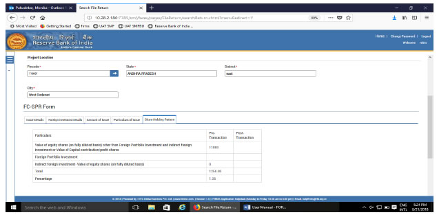 | | Name | Enter the name of the resident investor making downstream investment | | Address | Enter the address of the resident investor making downstream investment | | PIN Code | Enter the Pin code and click on the Right arrow. If the PIN code is available in the system, the State and District are auto-filled. Or else, enter the State and district. The details are editable | | Date on which the investment become Indirect foreign investment | Select the date on which the investment by the resident investor in the indian Investee company became indirect foreign investment for the investee company, as per Regulation 14 of FEMA 20(R). | | Date of allotment | Select the date on which the capital instruments were issued to the resident investor by the Indian investee company. This date would be same as Date on which the investment become Indirect foreign investment if the investment by resident investor is downstream investment, in terms of Regulation 14 of FEMA 20(R), at the time of allotment itself. | | Amount (in Rs) | Amount of inflow for the investment in Rs | | Type of instruments | Select from the type of instrument, drop down menu. | | Number of instruments | Enter the number of instruments | | Conversion ratio | Enter the conversion ratio | | Number of shares on a fully diluted basis | Auto-filled as per the number of instruments and conversion ratio. | | Face value of equity shares | Enter the face value of the equity shares. | | Value of shares | Auto-calculated as per Number of shares on fully diluted basis and the Face value of the shares | | Declaration | Declaration text- I hereby declare that I have verified the information provided in this form and certify that the information provided is true, complete and correct. In case of any discrepancy in the above information, I may be held liable for the same. These declarations and submissions are made in compliance to the Foreign Exchange Management Act, 1999.” Check upon completing all details in the form and attach, any other document (s), if any. | Step 4.2 : Tab 2 –Shareholding pattern