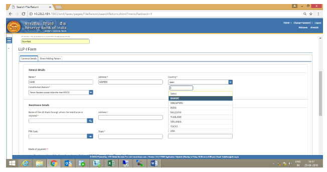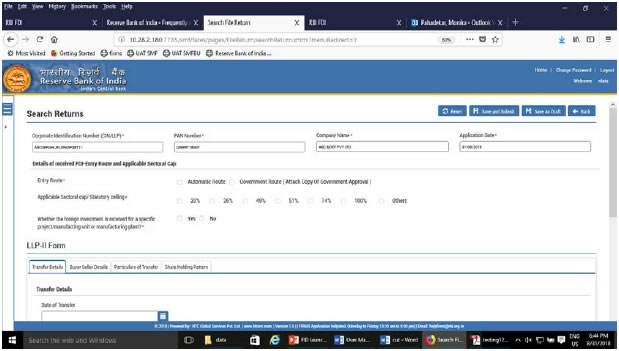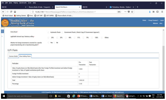 Step 4.1: Tab 1: Common details | Field Name | Description | | General Details | Enter the details of the person resident outside India making the capital contribution in the LLP as Name, address, country and constitution nature | | Remittance details | Select the name of the AD bank through which the remittance has been received. Enter the address and select the PIN code through the search option. State and City are auto-populated. In case the state or city auto-populated is not correct, edit the same accordingly. | | Mode of Payment | Select the mode of payment, as applicable, from the radio button as Remittance through banking channel Date of remittance Amount remitted in rs Attachments : FIRC and KYC NRE/FCNR Date of Debit Amount in rs Attachments: Debit statement Others: Others (please specify) Date of Remittance Amount in Rs Attachment: As applicable | | Value of Capital contribution | Value of capital contribution by the person resident outside India in the LLP. | | Total Capital contribution in the LLP | Value of capital contribution in the LLP from all investors including resident and non-resident | | Total Value of Capital contribution in Rs for all investors | In case where the capital contribution is being received at the same date from multiple foreign investors and the applicant wishes to file for all investors in one form LLP-I, enter the total value of capital contribution for all such foreign investors. For entering the details for other foreign investors, file another form LLP-I as the LLP-I has the provision of entering only one investor details. | | Fair value | Enter the fair value and attach the valuation certificate | | Remarks | Enter remarks if any. | | Declaration and other attachments | Declaration text -I hereby declare that I have verified the information provided in this form and certify that the information provided is true, complete and correct. In case of any discrepancy in the above information, I may be held liable for the same. These declarations and submissions are made in compliance to the Foreign Exchange Management Act, 1999. I hereby attach requisite Declaration and other relevant attachment(s) for this reporting. Select the check box and attach other documents, if any. | Step 4.2-Tab 2-Shareholding Pattern | Field name | Description | | Shareholding pattern | | Particulars | Pre-Transaction | Post-Transaction | | Value of equity shares (on fully diluted basis) other than Foreign Portfolio Investment and indirect foreign investment or Value of Capital contribution/profit shares | | | | Foreign Portfolio Investment | | | | Indirect foreign investment- Value of equity shares (on fully diluted basis) | | | | Total | | | | Percentage | | | Pre transaction values are auto-populated from the Entity Master (tab 3) Post transaction values are auto-calculated based upon the details provided in the form. Post transaction=Pre transaction value of shares + Value of shares reported in the form. The Business user shall ensure that the details are correctly filled in the form, so that the shareholding pattern which is auto- calculated is correct. | Step 4.3: After filling in all details, click on Save and Submit for submitting the form. “Save as draft” feature: The Business User can also save the draft and submit later, by filling in all mandatory details in the “Common details” page. “Reset” feature : This will reset the complete form. “Back” button: To go back to the Dashboard LLP-II Step 1: Login into SMF and reach your workspace. Click on the left navigation button and select Single Master Form. Step 2 : Click on drop down menu “Return Type”. Select “Form LLP-II” and click on Add new return. The user will be taken to form LLP-II. The complete form is arranged into two parts, Common Investment details and “Form LLP-II” which is further arranged into 4 tabs. (Common Investment details: These details are common to all returns that can be reported in SMF.) Step 3: Fill up the common investment details as below:  | Field Name | Description | | CIN | Pre-filled, non-editable as per the BU registration details | | Company name | Pre-filled, non-editable as per the BU registration details | | PAN number | Pre-filled, non-editable as per the BU registration details | | Application date | Pre-filled, non-editable, system date | | Entry Route* | Select Automatic or Government as applicable for the investment being reported. In case the Government route is selected attach the requisite Government approvals. Clarification: where the company belongs to a sector with mixed entry routes, for example brownfield pharmaceuticals where up to 74% is under automatic route and beyond up to 100% under Government route. If the investment being reported is under 74%. The entry route selected shall be automatic and in case the investment being reported would result into foreign investment beyond 74%, the entry route selected shall be government with relevant government approvals attached. | | Applicable Sectoral cap/ Statutory ceiling* | Applicable sectoral cap as per FEMA 20(R). Clarification: where the company belongs to a sector with mixed entry routes, for example brownfield pharmaceuticals where up to 74% is under automatic route and beyond up to 100% under Government route, the applicable sectoral cap would be 100%. | | Whether the foreign investment received is for a specific project/ manufacturing unit/ plant? | Select Yes or No as applicable. If yes is selected, fill up the details as below: