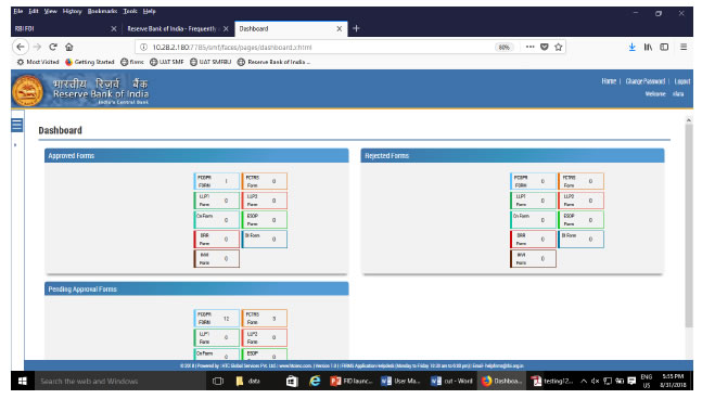 | Field name | Description | | Shareholding pattern | | Particulars | Pre-Transaction | Post-Transaction | | Value of equity shares (on fully diluted basis) other than Foreign Portfolio Investment and indirect foreign investment or Value of Capital contribution/profit shares | | | | Foreign Portfolio Investment | | | | Indirect foreign investment- Value of equity shares (on fully diluted basis) | | | | Total | | | | Percentage | | | Pre transaction values are auto-populated from the Entity Master (tab 3) Post transaction values are auto-calculated based upon the details provided in the form. Post transaction=Pre transaction value of shares + Value of shares reported in the form. The Business user shall ensure that the details are correctly filled in the form, so that the shareholding pattern which is auto- calculated is correct. | Step 4.3: After filling in all details, click on Save and Submit for submitting the form. “Save as draft” feature: The Business User can also save the draft and submit later, by filling in all mandatory details in the “Common details” page. “Reset” feature : This will reset the complete form. “Back” button: To go back to the Dashboard. Step 4.4 For subsequent filing of Form DRR: Wherein the Amount raised as in a DRR issue has not been repatriated in India in one go and is kept abroad. In such cases wherever the amount is being repatriated in subsequent tranches, for every subsequent tranche Form DRR shall be filed within 30 days from the date of remittance as a subsequent form DRR to the Form DRR as filed at the time of issue of DRs, as below: Step 4.4.1: Using the left navigation button select File Return and then Single Master Form. Step 4.4.2: Select Return Type as Form DRR. If the reference number of the earlier filed form DRR is known, enter the same in the field Return Reference Number and click on search return. Or else, enter the From date and search return. Select the initial filed Form DRR and open the same upon clicking on the reference number. Step 4.4.3: At the top right select the button “ADD subsequent return”. Enter the amount Amount repatriated in the current tranche in Rs. No other field needs to be entered. The values in Total amount repatriated in India and the Amount kept abroad are updated accordingly. Check the details under the tab “Tranche details”. Step 4.4.4. Check the declaration and attach the FIRC for the amount repatriated in the “Other attachments” and click on “Submit” button at top right. 6. Shareholding pattern 1. Shareholding pattern details are being obtained with the purpose to ensure that the foreign investment in an entity is within the permissible foreign investment limit/ sectoral caps/regulatory limits. 2. In the entity master, the companies and LLPs were instructed to provide the latest shareholding pattern, all inclusive irrespective whether the same is reported or not reported or acknowledged or not acknowledged. 3. In case where the company or LLP is making a filing in SMF for a past transaction which was not reported earlier, but the same has been included in the shareholding pattern provided in the Enitiy master, at the time of reporting the same in SMF, the shareholding pattern should not change. In such scenarios, the BU, where he is asked to specify “Whether the change in the shareholding pattern due to this transaction being reported has already been accounted in the pre transaction shareholding pattern:” shall select YES. This would ensure that the shareholding pattern is not affected. 4. It may be noted that upon successful acknowledgement of the filed forms at AD level, the entity master details are automatically updated with the post shareholding pattern as per the acknowledged form. Therefore, the user shall take due precaution while specifying for this detail. 7. Processing at AD level Login Procedure Step 1: Go to the website at https://fed.rbi.org.in Step 2: Select User type as Bank user and click on radio button for FIRMS. Enter the username and password as provided by RBI and click on Login. The dashboard for the AD bank is as below: Verifying eKYC for the Business user Step -1 Using the left navigation button select user verification and then RBI user master. All pending approvals for eKYC would be displayed. Step 2: Click on the View Button to see all the details for the Business User. Step 3: Download the authority letter using download button. Step 4: Verify the details as entered with the authority letter. Approve or Reject the registration accordingly. An email notification would be sent to the applicant accordingly. AD bank will have 3 working days for verifying the eKYC of the Business User. Verifying the filed forms Step 1 : Using the left Navigation button go to File return and then to Approve form Step 2 : Select the return type, enter the from and to date and select the status as pending approval and click on search return. All form of the return type would be displayed. Select the form as desired. The form will open up with all details as filed by the Business user along with the Entity details and Check list. Step 3: Go through the details as filed by the Business User and verify the same with attached documents. Procedure of scrutiny: The checklist provides the details that needs to be verified for acknowledging the filed return. A set of checklist as applicable to that particular return is being provided to the AD bank along with the filed form. AD bank is required to check only those details and if found to be in order, approve the return. In case the Business user has not provided the details, AD Bank shall reject the form. It may be noted that there is no provision for resending or attaching any clarification once the form is submitted. Therefore, AD may take due caution while approving or rejecting the same. In exception cases where for the specific reasons the AD needs to refer the form to RBI, AD may select the Regional Office from the drop d