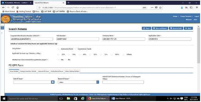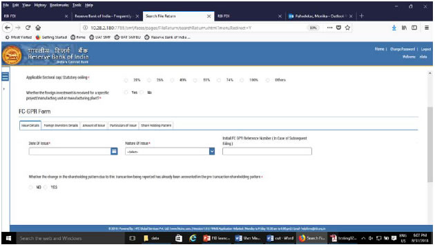 | Field Name | Description | | CIN | Pre-filled, non-editable as per the BU registration details | | Company name | Pre-filled, non-editable as per the BU registration details | | PAN number | Pre-filled, non-editable as per the BU registration details | | Application date | Pre-filled, non-editable, system date | | Entry Route* | Select Automatic or Government as applicable for the investment being reported. In case the Government route is selected attach the requisite Government approvals. Clarification: where the company belongs to a sector with mixed entry routes, for example brownfield pharmaceuticals where up to 74% is under automatic route and beyond up to 100% under Government route. If the investment being reported is under 74%. The entry route selected shall be automatic and in case the investment being reported would result into foreign investment beyond 74%, the entry route selected shall be government with relevant government approvals attached. | | Applicable Sectoral cap/ Statutory ceiling* | Applicable sectoral cap as per FEMA 20(R). Clarification: where the company belongs to a sector with mixed entry routes, for example brownfield pharmaceuticals where up to 74% is under automatic route and beyond up to 100% under Government route, the applicable sectoral cap would be 100%. | | Whether the foreign investment received is for a specific project/ manufacturing unit/ plant? | Select Yes or No as applicable. If yes is selected, fill up the details as below: | PIN Code | Enter the PIN code and click on arrow. If the PIN code is not available, enter the nearby PIN code | | State | Pre-filled as per PIN code (editable) | | City/District | Enter the city/district (editable) | | Brownfield/Greenfield | Enter brownfield or greenfield as applicable for the investment. | | The complete form is arranged into two parts, Common Investment details and “Form FC-GPR” which is further arranged into 5 tabs. (Common Investment details: These details are common to all returns that can be reported in SMF.) Step 3: Fill up the common investment details as below: Step 4 : Fill up the details in form FC-GPR as below : Step 4.1: Tab 1: Issue details