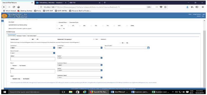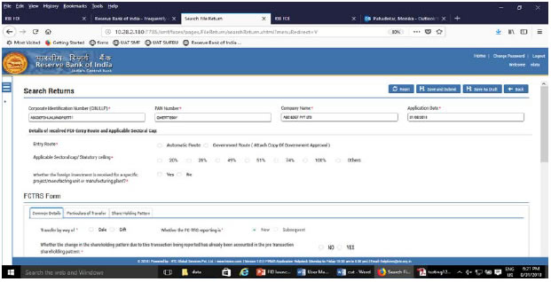 | Field Name | Description | | CIN | Pre-filled, non-editable as per the BU registration details | | Company name | Pre-filled, non-editable as per the BU registration details | | PAN number | Pre-filled, non-editable as per the BU registration details | | Application date | Pre-filled, non-editable, system date | | Entry Route* | Select Automatic or Government as applicable for the investment being reported. In case the Government route is selected attach the requisite Government approvals. Clarification: where the company belongs to a sector with mixed entry routes, for example brownfield pharmaceuticals where up to 74% is under automatic route and beyond up to 100% under Government route. If the investment being reported is under 74%. The entry route selected shall be automatic and in case the investment being reported would result into foreign investment beyond 74%, the entry route selected shall be government with relevant government approvals attached. | | Applicable Sectoral cap/ Statutory ceiling* | Applicable sectoral cap as per FEMA 20(R). Clarification: where the company belongs to a sector with mixed entry routes, for example brownfield pharmaceuticals where up to 74% is under automatic route and beyond up to 100% under Government route, the applicable sectoral cap would be 100%. | Step 4: Select the Transaction type from the drop down menu as applicable: