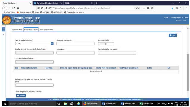 | Field Name | Description | | Type of capital instrument | Select the type of capital instrument as transferred from the drop down menu. In case of gift, if the shares are transferred select as “Shares transferred as Gift”, if not, then the capital instrument as transferred | | Number of Instruments | Enter the number of instruments as transferred. | | Conversion ratio | In case of Equity shares, partly paid up shares, shares transferred as Gift, participating interest/rights in oil fields enter as 1:1. For CCDs /CCPs/ share warrants enter the pre-fixed upfront conversion ratio. (In case there is no upfront conversion ratio enter the ratio as per the maximum permissible conversion of CCDs/CCPs/share warrants into equity shares in compliance to the pricing guidelines). | | Number of equity shares on fully diluted basis | Auto-populated as per the conversion ratio and the number of instruments | | Face value | Enter the face value of the equivalent equity shares. In case of CCDs/CCPs /share warrants do NOT enter the face value of CCDs/CCPs/share warrants as it will not give the correct shareholding pattern. For participating interest/rights in oil fields enter the value as 0 (zero). | | Transfer price per instrument | Transfer price. For Gift, enter transfer price as 0 (zero). | | Total amount consideration | Auto-calculated as Number of instruments multiplied by transfer price per instrument. | | “ADD” button | Click on the ADD button after entering above details and check that all details are reflected in the adjoining table. In case of multiple instruments being transferred repeat the above process. In case the entered details needs to be modified click on the Edit icon in the table. The details would be re-populated in the fields, modify accordingly and click on Save Button. Check for the details in the adjoining table. In case the details needs to be deleted click on the Delete icon in the table. | | Fair value of the capital instruments at the time of transfer | Enter the fair value of the capital instrument being transferred and attach the valuation certificate form the authorized person and Transfer agreement (relevant extracts) along with the consent letter of buyer and seller at “Valuation certificate.” In case where multiple instruments are being transferred, enter the fair value of one instrument and attach a clarificatory letter along with the valuation certificates at the attachment “Valuation certificate” In case of Gift, the field may be kept blank. | Step 4.3 : Tab 3-Remittance Details – Not applicable for Transfer by Gift