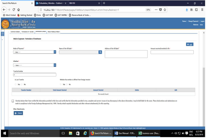 | Field Name | Description | | Mode of payment | Select from the drop down menu | | Name of AD bank | Click on the search icon. A pop-up window will open, select the AD bank facilitating the transfer. | | Address of the AD bank | Address is auto-populated based on bank selection. In case the address is not correct, edit the details accordingly. | | Amount remitted/received in Rs | Amount in Rs as being received or remitted in this reporting | | Whether and Tranche number | Select from the drop down menu as below Payment on full consideration | Date of remittance | Enter the Date of Remittance. In case the remittance date is future date, it may be left blank. | | Tranche number | Enter tranche number as 1 | | Is last tranche | Select Yes | Payment on deferred basis In case it is first tranche payment | Tranche number | Enter Tranche number as 1 (one) | | Amount in the tranche | Enter the Amount as received in the tranche | | Date of remittance | Enter the Date of Remittance. In case the remittance date is future date, it may be left blank. | | Is last tranche | Select YES or NO as applicable | In case it is 2,3,4…..etc tranche | Tranche number | Enter Tranche number as 2,3…etc as applicable | | Amount in previous tranche(s) | Enter the total amount as received in all earlier tranche(s). | | FC-TRS details | Enter the FC-TRS reference number along with the tranche amount reported in the FC-TRS | | Amount in the tranche | Enter the Amount as received in this tranche | | Date of remittance | Enter the Date of Remittance. In case the remittance date is future date, it may be left blank. | | Is last tranche | Select YES or NO as applicable | Indemnity Arrangement In case it is first FC-TRS reporting | Tranche number | Enter Tranche number as 1 | | Amount indemnified /Amount being paid as indemnity | Enter the Amount indemnified in Rs | | Date of remittance | Enter the Date of Remittance. In case the remittance date is future date, it may be left blank. This date is the date on which the Amount is received for the transfer | | Is last tranche | Select NO | In case it is first FC-TRS reporting for reporting indemnity payment | Tranche number | Enter Tranche number as 2 | | Amount in previous tranche(s) | Enter the total amount as received in all previous tranches | | FC-TRS details | Enter the FC-TRS reference number along with the tranche amount reported in the FC-TRS | | Amount Indemnified /Amount paid as Indemnified in Rs | Enter the Amount being paid as indemnity | | Date of Remittance | Enter the date of remittance. | | Is last tranche | Select YES or No as applicable | | | Whether the remitter is different from a foreign investor | Please select “NO” if the remitter is same as the foreign investor. In case the two are different (third party payment, if permissible), Please select “YES” enter the details viz., Name of the Remitter, Country of remitter, relationship between Remitter and foreign investor and attach the requisite documents | | Declaration | Declaration text- I hereby declare that I have verified the information provided in this form and certify that the information provided is true, complete and correct. In case of any discrepancy in the above information, I may be held liable for the same. These declarations and submissions are made in compliance to the Foreign Exchange Management Act, 1999. I hereby attach requisite Declaration and other relevant attachment(s) for this reporting.* Check upon completing all details in the form. | Step 5.5-Tab 5-Shareholding Pattern