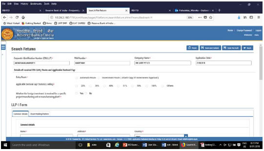 | Field Name | Description | | CIN | Pre-filled, non-editable as per the BU registration details | | Company name | Pre-filled, non-editable as per the BU registration details | | PAN number | Pre-filled, non-editable as per the BU registration details | | Application date | Pre-filled, non-editable, system date | | Entry Route* | Select Automatic or Government as applicable for the investment being reported. In case the Government route is selected attach the requisite Government approvals. Clarification: where the company belongs to a sector with mixed entry routes, for example brownfield pharmaceuticals where up to 74% is under automatic route and beyond up to 100% under Government route. If the investment being reported is under 74%. The entry route selected shall be automatic and in case the investment being reported would result into foreign investment beyond 74%, the entry route selected shall be government with relevant government approvals attached. | | Applicable Sectoral cap/ Statutory ceiling* | Applicable sectoral cap as per FEMA 20(R). Clarification: where the company belongs to a sector with mixed entry routes, for example brownfield pharmaceuticals where up to 74% is under automatic route and beyond up to 100% under Government route, the applicable sectoral cap would be 100%. | | Whether the foreign investment received is for a specific project/ manufacturing unit/ plant? | Select Yes or No as applicable. If yes is selected, fill up the details as below: | PIN Code | Enter the PIN code and click on arrow | | State | Pre-filled as per PIN code | | City/District | Enter the city/district | | Brownfield/Greenfield | Enter brownfield or greenfield as applicable for the investment. | | Step 4 : Fill up the details in form LLP-I as below :