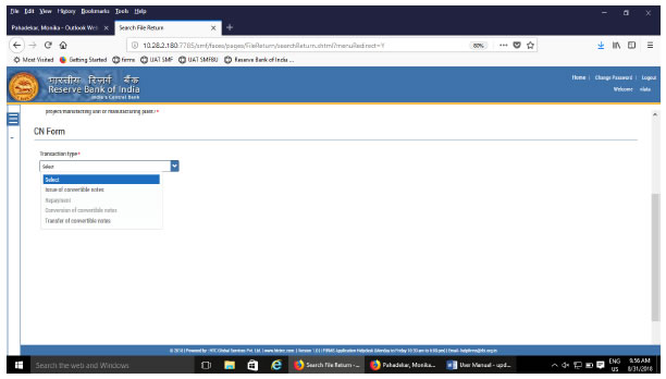 | Drop down options | Description | | Issue of convertible notes | Select this option where the convertible notes are being issued to person(s) resident outside India as per FEMA 20 (R) | | Repayment | Select this option where the amount received in lieu of issuance of convertible notes is being repaid to person (s) resident outside India as per FEMA 20 (R) | | Conversion of Convertible notes | Select this option where the convertible notes as issued to person (s) resident outside India is being converted into equity shares | | Transfer of convertible notes | Select this option where the convertible is being transferred from a person resident outside India to a person resident in India (including NRI on Non repatriation basis) or vice-versa | Step 5.1: For issue of Convertible Notes