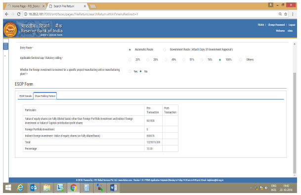 | | Equivalent equity shares on fully diluted basis | Auto-calculated as per Number of ESOPs issued and the conversion ratio | | Face value of equity shares | Enter the face value of the underlying Equity shares | | Whether the change in the shareholding pattern due to this transaction being reported has already been accounted in the pre transaction shareholding pattern:* | Select Yes or No In case Yes is selected then there will not be any change in the shareholding pattern for this transaction being reported. In case No is selected, a field for Paid up capital on fully diluted basis will pop-up. Enter the paid up capital value on fully diluted basis. The changes would be reflected in the shareholding pattern for this transaction being reported accordingly. | | Value of shares in Rs | Auto-calculated as per Equivalent equity shares on fully diluted basis and the face value of equity shares | | Declaration | Declaration text- “I hereby declare that I have verified the information provided in this form and certify that the information provided is true, complete and correct. In case of any discrepancy in the above information, I may be held liable for the same. These declarations and submissions are made in compliance to the Foreign Exchange Management Act, 1999. I hereby attach requisite Declaration, CS certificate and other relevant attachment(s) for this reporting.”* Check upon completing all details in the form. | Step 4.2 : Tab 2 –Shareholding pattern