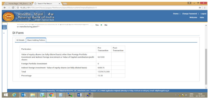 | Field name | Description | | Shareholding pattern | | Particulars | Pre-Transaction | Post-Transaction | | Value of equity shares (on fully diluted basis) other than Foreign Portfolio Investment and indirect foreign investment or Value of Capital contribution/profit shares | | | | Foreign Portfolio Investment | | | | Indirect foreign investment- Value of equity shares (on fully diluted basis) | | | | Total | | | | Percentage | | | Pre transaction values are auto-populated from the Entity Master (tab 3) Post transaction values are auto-calculated based upon the details provided in the form. Post transaction=Pre transaction value of shares + Value of shares reported in the form. The Business user shall ensure that the details are correctly filled in the form, so that the shareholding pattern which is auto- calculated is correct. | Step 4.3: After filling in all details, click on Save and Submit for submitting the form. An intimation message would Pop-up as “The applicant may file form FC-GPR as and when the ESOPs are exercised. If the ESOPs are linked to ADR/GDR, form DRR may be filed upon exercise of such ESOPs”. Please click Yes and form submission is complete. “Save as draft” feature: The Business User can also save the draft and submit later, by filling in all mandatory details in the “Common details” page. “Reset” feature : This will reset the complete form. “Back” button: To go back to the Dashboard. FORM DI Step 1: Login into SMF and reach your workspace. Click on the left navigation button and select Single Master Form. Step 2 : Click on drop down menu “Return Type”. Select “Form DI” and click on Add new return. The user will be taken to form DI. The complete form is arranged into two parts, Common Investment details and “Form DI” which is further arranged into 2 tabs. (Common Investment details: These details are common to all returns that can be reported in SMF.) Step 3: Fill up the common investment details as below: