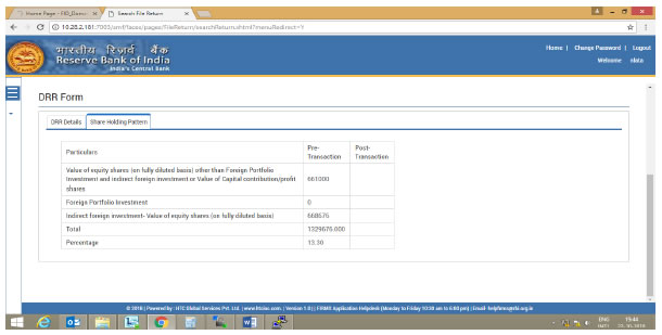 | Field name | Description | | Name of the Domestic custodian | Name of the Domestic custodian for the DR issue | | Address of the Domestic custodian | Address of the Domestic custodian for the DR issue | | Name of the Global Custodian | Name of the Global custodian for the DR issue | | Address of the Global Custodian | Address of the Global custodian for the DR issue. | | Date of issue | Date on which the DRs have been issued | | Country | Country in which the DRs have been issued | | Number of DRs issued | Number of DRs as issued | | Underlying securities | Select the underlying securities to the DRs issued | | Conversion Ratio | Conversion for the DRs issued. Where the underlying security is other that capital instruments i.e. debt or units, conversion ratio shall be 1:0. | | Number of equity shares on fully diluted basis | Auto-calculated as per Number of DRs issued and conversion ratio | | Face value of equity shares | Face value of the equity shares | | Value of shares | Auto-calculated as per number of shares on fully diluted basis and the face value | | Amount raised in Rs | Total amount as raised in the DR issue being reported. | | Issue expenses, if any, in Rs | Issue expenses as incurred in the DR issue, if any. | | Amount repatriated in the current tranche in Rs | The amount as being repatriated in India so far. | | Total Amount repatriated in India in Rs | Total amount repatriated in India, so far | | Amount kept abroad in Rs | Auto-calculated as per Amount raised in Rs and Total amount repatriated in India in Rs | | Whether the change in the shareholding pattern due to this transaction being reported has already been accounted in the pre transaction shareholding pattern:* | Select Yes or No In case Yes is selected then there will not be any change in the shareholding pattern for this transaction being reported. In case No is selected, a field for Paid up capital on fully diluted basis will pop-up. Enter the paid up capital value on fully diluted basis. The changes would be reflected in the shareholding pattern for this transaction being reported accordingly. | | Whether sponsored? | Select Yes or No If Yes, then enter the Name of sponsor and the address of the sponsor | | Whether the DR is listed on an International Exchange or trading platform | Select Yes or No If Yes, then enter the name of the stock exchange and the Date of commencement of trading on the same | | Declaration | Declaration text- I hereby declare that I have verified the information provided in this form and certify that the information provided is true, complete and correct. In case of any discrepancy in the above information, I may be held liable for the same. These declarations and submissions are made in compliance to the Foreign Exchange Management Act, 1999. Check upon completing all details in the form and attach other documents, if any. | Step 4.2-Tab 5-Shareholding Pattern