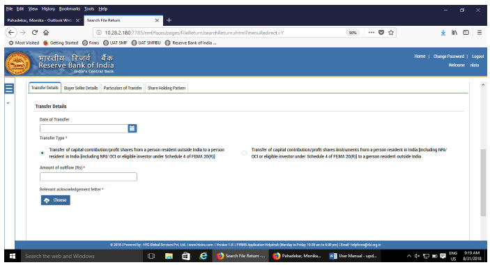 | Field name | Description | | Date of transfer | Select the date of transfer. In case, it is a future date select the current date. | | Type of transfer | Select from the following options as applicable Transfer of capital contribution/profit shares from a person resident outside India to a person resident in India [including NRI/ OCI or eligible investor under Schedule 4 of FEMA 20(R)] Please provide the acknowledgement letter for the initial investment Enter the amount of Outflow in Rs Transfer of convertible notes from a person resident in India ((Including investment by NRI/OCI or eligible Investor under Schedule 4 of FEMA 20(R))) to a person resident outside India Enter the amount of inflow in Rs | | Details of the Buyer | Enter the details of the buyer | | Details of the seller | Enter the details of the seller | | Details of the AD bank | Select the name of the AD bank facilitating the transfer and check for the address. If the same is incorrect, modify the same accordingly. | | Mode of payment | Select the mode of payment from the following (check boxes) - Remittance through banking channel