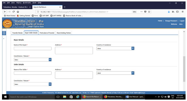 | Field name | Description | | Buyer details | Enter the name and address of the buyer. Select the country of residence and constitution/nature from the drop down menu | | Seller details | Enter the name and address of the seller. Select the country of residence and constitution/nature from the drop down menu | Step 4.3: Tab 3- Particulars of Transfer  | Field name | Description | | Whether the change in the shareholding pattern due to this transaction being reported has already been accounted in the pre transaction shareholding pattern:* | Select Yes or No accordingly. For explanation refer to the head under “Shareholding pattern” | | Value of capital contribution in Rs | Enter the value of capital contribution being transferred | | Fair price in Rs | Enter the fair value of the capital contribution and attach the valuation certificate | | Remittance Details | Select the name of the AD bank facilitating remittance for this transfer and enter the address of the same | | Remittance details –Mode of Payment | Select the applicable mode of payment from the following options (check box) Remittance through banking channel Remittance date Amount remitted in rs Attachments : FIRC and KYC NRE/FCNR NRE remittance date NRE Amount remitted in rs Attachments: Debit statement Others: Others (please specify) Other Mode of Payment …Description Other Remittance date Other Amount Remitted in Rs Attachments :Other Payment (necessary documents as applicable) In case the total payment has been received through multiple modes of payment, select multiple check boxes accordingly. | | Declaration | Declaration text- I hereby declare that I have verified the information provided in this form and certify that the information provided is true, complete and correct. In case of any discrepancy in the above information, I may be held liable for the same. These declarations and submissions are made in compliance to the Foreign Exchange Management Act, 1999. I hereby attach requisite Declaration and other relevant attachment(s) for this reporting. Check the declaration box and attach requisite declaration and other attachments, if any | Step 4.4: Tab 4- Shareholding pattern