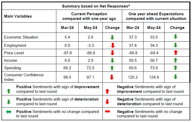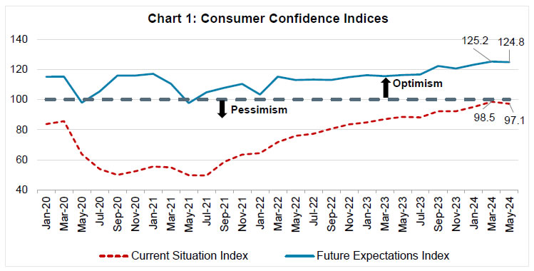वर्तमान अवधि के लिए उपभोक्ता विश्वास की उर्धगति में ठहराव देखा गया है, क्योंकि नवीनतम सर्वेक्षण दौर में खर्च को छोड़कर सभी मापदंडों पर धारणाओ में कुछ अवनति दर्ज की गई है; वर्तमान स्थिति सूचकांक (सीएसआई)2 दो महीने पहले के 98.5 से घटकर मई 2024 में 97.1 हो गया है (चार्ट 1; टेबल 1, 2, 3, 5 और 6)।