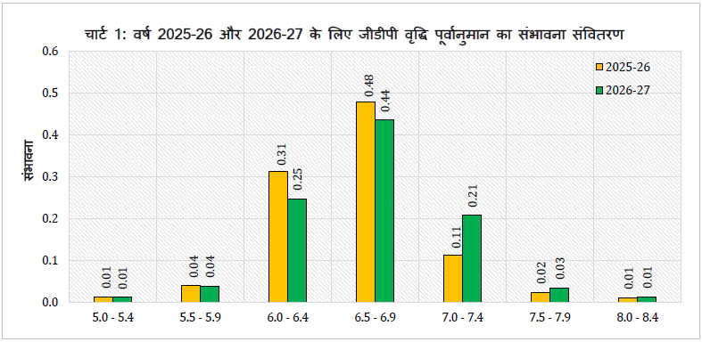 पूर्वानुमानकर्ताओं ने वर्ष 2025-26 और वर्ष 2026-27 दोनों के लिए 6.5-6.9 प्रतिशत की सीमा में वास्तविक जीडीपी वृद्धि की उच्चतम संभावना जताई है (चार्ट 1)।