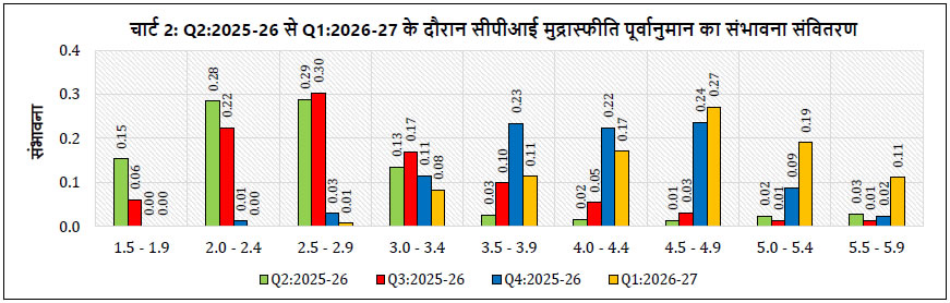 हेडलाइन सीपीआई मुद्रास्फीति (वर्ष-दर-वर्ष) 2025-26 की दूसरी तिमाही के दौरान 2.4 प्रतिशत और 2025-26 की तीसरी तिमाही के दौरान 2.7 प्रतिशत रहने की उम्मीद है। इसके बाद, 2025-26 की चौथी तिमाही में 4.3 प्रतिशत और 2026-27 की पहली तिमाही में 4.7 प्रतिशत तक बढ़ने की उम्मीद है (सारणी 3)।