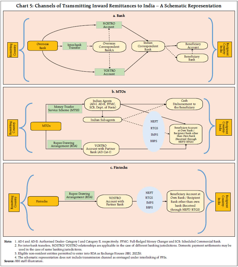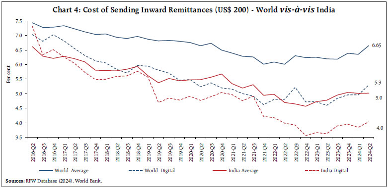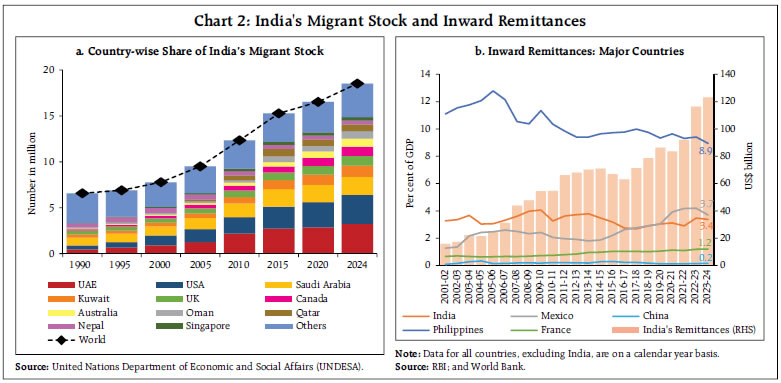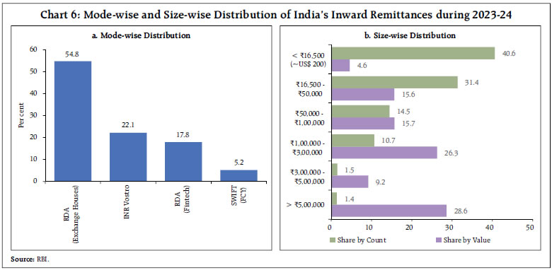 by Dhirendra Gajbhiye, Sujata Kundu, Alisha George, Omkar Vinherkar, Yusra Anees and Jithin Baby^ This article analyses results of the sixth round of India’s remittances survey conducted for 2023-24. Key findings suggest that the share of advanced economies in India’s inward remittances has risen, surpassing the share of Gulf economies, reflecting a shift in migration pattern towards skilled Indian diaspora. Maharashtra, followed by Kerala and Tamil Nadu continue to be the dominant recipient states. The cost of sending remittances to India is lower than the global average cost, driven by digitalisation but remains higher than the SDG target of 3 per cent for US$ 200. Furthermore, fintech companies offer affordable cross-border remittance services, fostering competition among different remittance service providers. Introduction India’s remittances have more than doubled from US$ 55.6 billion in 2010-11 to US$ 118.7 billion in 2023-24. While financing around half of India’s merchandise trade deficit1, net remittance receipts have been an important absorber of external shocks during this period. Moreover, India’s remittance receipts have generally remained higher than India’s gross inward foreign direct investment (FDI) flows, thus establishing their importance as a stable source of external financing. Furthermore, following a pandemic-induced contraction of 3.6 per cent during 2020-21, remittances to India in the post pandemic period (2021-22 to 2023-24) recorded a resurgence with an average annual growth of 14.3 per cent. Against this backdrop, this article presents the results of the sixth round of the survey on India’s inward remittances conducted for 2023-24.2 It captures various dimensions of inward remittances to India – country-wise source of remittances, state-wise destination of remittances, transaction-wise size of remittances, prevalent modes of transmission, cost of sending remittances to India and share of remittances transmitted through the digital modes vis-à-vis cash. The survey results are based on responses received from 30 authorised dealer (AD) banks (covering around 99 per cent of the total value of inward remittances reported under family maintenance and savings3). The survey also covered two major Money Transfer Operators (MTOs)4 and two fintech companies5 operating in cross-border remittances business. This round of survey has the following enhancements over the previous rounds to improve the coverage and data quality: (i) expanding the coverage of source countries; (ii) classifying the coverage of Rupee Drawing Arrangement (RDA) into exchange houses/MTOs and fintechs; (iii) expanding the range and number of remittance size brackets; (iv) covering cash/digital transfers undertaken by MTOs; and v) including two leading fintech companies providing cross-border remittance services to assess the growing impact of digitalisation. Globally, inward remittances represent the flow of cross-border household income, arising from the temporary or permanent movement of people to foreign economies. Moreover, as defined by the International Monetary Fund (IMF, 2009), two items in an economy’s balance of payments (BoP) statistics relate to remittances – compensation of employees under primary income account and personal transfers under secondary income account. In the case of India, personal transfers, primarily comprising inward remittances for family maintenance from Indian workers residing abroad, and local withdrawals from non-resident deposit accounts, form the major portion of cross-border inward remittances. The rest of the article is organised as follows – Section II presents the stylised facts on global and India’s inward remittances. Section III describes the different channels of receiving remittances in India. Section IV details the findings of the sixth round of the survey. Section V concludes the article with some policy suggestions. II. Stylised Facts World remittances are estimated to reach US$ 905 billion in 2024, with low-and middle-income countries (LMICs) receiving more than 75 per cent (around US$ 685 billion) [Ratha et al., 2024]. According to the World Bank, India has continued to remain the top recipient of remittances since 2008, with its share in world remittances rising from around 11 per cent in 2001 to about 14 per cent in 2024. Going forward, remittances to India are likely to remain elevated and are projected to increase to around US$ 160 billion in 2029 (RBI, 2024).6 Other major recipients of remittances include Mexico, China, Philippines, France, Pakistan, and Bangladesh (Chart 1). While the flow of remittances to India remained resilient albeit with some year-on-year contraction during the pandemic year 2020-21, its resurgence since then has been driven by a recovery in employment conditions in the advanced economies (AEs).  India’s stock of international migrants has tripled from 6.6 million in 1990 to 18.5 million in 2024, with its share in global migrants rising from 4.3 per cent to over 6 per cent during the same period.7 Indian migrants in the Gulf Cooperation Council (GCC) countries account for around half of the total Indian migrants in the world (Chart 2a). Following the competitive edge and the penetration of Indian IT services overseas at the start of the century, the number of skilled emigrants to AEs, especially to the US, has risen significantly (Chakravorty et al., 2016; Khanna and Morales, 2023). Thus, besides GCC countries, AEs have also emerged as a major source of inward remittances to India over the years, reflecting the changing dynamics of India’s diaspora. As India’s working age population is expected to rise till 2048, India would be the world’s leading supplier of labour (RBI, 2024). Thus, the continuous upskilling and reskilling of the workforce would be crucial to leverage its potential. As a ratio to GDP, India’s remittances have hovered around 3 per cent of GDP since 2000, while in the 