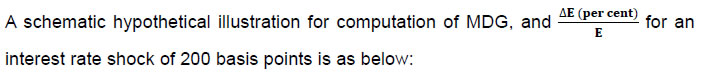 MDA and MDL are the weighted average of the Modified Duration (MD) of items of RSA and RSL respectively. 260 The MDG, reflecting the degree of duration mismatch in the RSA and RSL in a bank’s balance sheet, shall be calculated with the help of the following formula: A higher absolute value of the MDG shall indicate greater exposure of the bank to interest rate shocks. 261 The impact of changes in the interest rates on the MVE shall be evaluated by computing ΔE with the help of following formula: wherein: (1) Equity shall mean Net Worth as defined in Reserve Bank of India (Small Finance Banks – Concentration Risk Management) Directions, 2025. (2) ‘ΔE’ stands for change in the value of equity. (3) ‘Δ i’ stands for change in interest rates in percentage points (1 per cent change to be written as 0.01). | Relationship between MDG and sensitivity of MVE to interest rate changes | | (₹ in crore) | | Particulars | Amount | | Equity as on date | 1350.00 | | RSA as on date | 18251.00 | | RSL as on date | 18590.00 | | MDA (Weighted Modified Duration of Assets) | 1.96 | | MDL (Weighted Modified Duration of Liabilities) | 1.25 | | MDG [1.96- {1.25*(18590/18251)}] | 0.687 | | ΔE = [MDG] * RSA * Δi | -250.77 | | For a 200 bps rise in rate of interest, MVE will fall by (250.77/1350) *100 | 18.58% | | 262 The estimated drop in MVE resulting from the prescribed interest rate shock shall indicate the economic impact on a bank’s equity, assuming the shock scenario materialises. This decline shall not be construed as an accounting loss as banking book is not marked to market. 263 The MDG framework is based on the utilization of book values of banking book assets and liabilities for the purpose of computation of MD. However, a bank that has the capability to use market value of assets and liabilities of banking book shall do so. The market values of assets and liabilities shall be determined by discounted cash flow method. The step-by-step approach for computing the MDG is as under: -