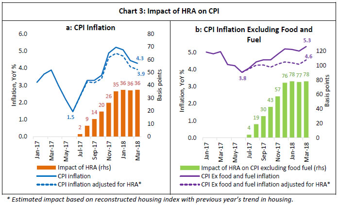 Since July 2017, housing index in CPI is inclusive of the impact of the 7th CPC’s HRA increase. To segregate this impact, CPI is reconstructed by replacing the housing index with an estimated index using the previous year’s trend. The gap between observed inflation and inflation from reconstructed index shows that over six months, the HRA increase gradually pushed up headline inflation by 35 bps and the impact remained till the latest data print of March 2018.7 The corresponding impact was more than double in CPI excluding food and fuel as house rent has a weight of 20.1 per cent in it (Chart 3).8