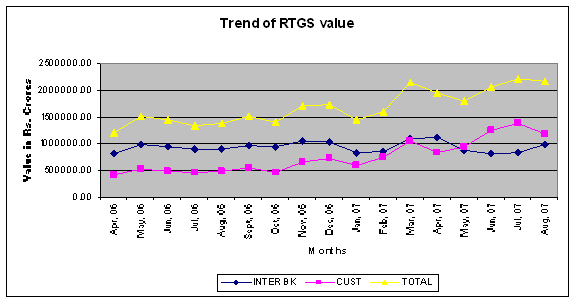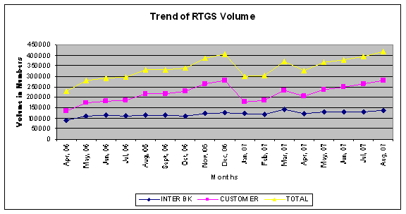 6.1.6 Real Time Gross Settlement (RTGS) System: The RTGS system was implemented in March 2004. The integration of the Integrated Accounting System (IAS) with RTGS has been implemented in July 2006. The liquidity management is now expected to be done by the participants itself. The monitoring of the request for IDL and its usage by individual participants is not being done presently – but would be taken up. The volume and value of transactions in RTGS on a monthly basis is given below: