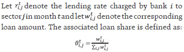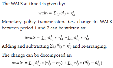 Box II.2: Decomposing Monetary Policy Transmission to Lending Rates: Price and Composition Effects in WALR The weighted average lending rate (WALR), commonly used to assess monetary policy transmission, is reflective of both changes in lending rates and shifts in the composition of credit across banks and sectors. Decomposing WALR into pure pricing effect and changes arising due to credit reallocation enables a more prescient evaluation of policy rate pass-through. Huerga and Steklacova (2008) provide an index number-based framework in which changes in aggregate interest rate can be decomposed into repricing and composition effects. Building on this insight, the analysis deconstructs the WALR using index-number theory.   The first term represents the interest rate effect, measuring the contribution of changes in lending rates holding loan shares constant at the base period (period 1). The second term captures the composition effect, reflecting shifts in loan shares or product-mix across banks and sectors. The decomposition is implemented in levels (basis points), allowing direct interpretation of contribution to changes in aggregate WALR. Accordingly, movements in WALR may not solely reflect pricing behaviour as compositional shifts in credit allocation can amplify or dampen observed transmission. Decomposition-based diagnostics, therefore, improve the assessment of monetary policy transmission and associated lags. | Table 1: Decomposition of Weighted Average Lending Rates (February 2025-February 2026) | | | Share (per cent) | WALR (per cent) | Transmission (bps) | | Sectors | Jan-25 | Feb-26 | Jan-25 | Feb-26 | Feb-26 (Constant) | Overall | Interest Rate Effect | Weight Effect | | (1) | (2) | (3) | (4) | (5) | (6) | (7)= (5)-(4) | (8)= (6)-(4) | (9)=(7)-(8) | | Agriculture | 10.9 | 12.9 | 10.29 | 9.76 | 10.06 | -53 | -23 | -30 | | Large industry | 31.0 | 28.6 | 8.08 | 7.04 | 7.00 | -104 | -108 | 4 | | MSMEs | 9.7 | 12.7 | 9.94 | 8.76 | 8.83 | -118 | -111 | -7 | | Infrastructure | 3.6 | 3.4 | 8.55 | 7.39 | 7.59 | -116 | -96 | -20 | | Trade | 9.8 | 8.5 | 8.38 | 7.57 | 7.48 | -81 | -90 | 9 | | Professional Services | 2.6 | 2.1 | 8.75 | 8.04 | 8.05 | -71 | -70 | -1 | | Credit Cards | 0.9 | 0.7 | 37.87 | 37.15 | 37.63 | -72 | -24 | -48 | | Education | 0.2 | 0.1 | 10.76 | 9.52 | 9.68 | -124 | -108 | -16 | | Vehicle | 2.3 | 2.0 | 10.67 | 9.60 | 9.84 | -107 | -83 | -24 | | Housing | 5.6 | 4.9 | 8.70 | 7.61 | 7.63 | -109 | -107 | -2 | | Other Personal Loans | 9.4 | 11.3 | 11.27 | 10.24 | 10.38 | -103 | -89 | -14 | | Rupee Export Credit | 2.0 | 1.5 | 8.39 | 7.30 | 7.25 | -109 | -114 | 5 | | Others | 12.0 | 11.3 | 8.86 | 7.87 | 7.90 | -99 | -96 | -3 | | Aggregate | 100.0 | 100.0 | 9.33 | 8.44 | 8.41 | -89 | -92 | 3 | Notes: 1. Weight is the corresponding share of loans out of total loans. 2. Transmission during February 2025-February 2026 is calculated by subtracting the WALR of January 2025 from that of February 2026. Sources: MPD06 return, RBI; and RBI staff calculations. | Sectoral WALRs are computed by aggregating banklevel data, which are subsequently used to arrive at the system-wide WALR. The WALR in period 1 (January 2025) was 9.33 per cent, which declined to 8.44 per cent in period 2 (February 2026). This implies that on a weighted average basis, banks have reduced their lending rates by 89 bps against a policy rate reduction of 125 bps. However, when the change in WALR is decomposed into interest rate effect and compositional shift in volume (weight effect), the pure interest rate transmission is (-) 92 bps, which is larger than a decline in overall WALR. Thus, compositional shift in lending worked in opposite direction, reducing the impact of interest rate effect by 3 bps. The above results indicate that even though lending rates declined across sectors, a shift in lending towards relatively higher interest rate sectors can partly offset this reduction through weight effect. As a result, the observed change in WALR may appear smaller, suggesting weaker policy transmission. Decomposing the change in WALR into interest rate and weight effects, therefore, provides a more realistic assessment of transmission. In essence, monetary policy transmission depends not only on change in lending rate but also on the change in composition of loan mix across sectors. Reference: Huerga, J. and Steklacova, L. (2008). An application of index numbers theory to interest rates. ECB Working Paper No. 939, September 22. | MCLR linked loans declined from 33.8 per cent to 32.0 per cent over the same period. Public sector banks (PSBs) still have a significant proportion of their loans linked to the MCLR (Chart II.30a). Private banks (PVBs) extend a large part of their loans linked to EBLR (Chart II.30b). The bulk of the external benchmark-based loans use policy repo rate as the benchmark. The MCLR and other legacy rates – based on internal benchmarks and having longer reset periods – impede the pace of policy transmission. Sectorally, PSBs have a high share of MCLR-linked loans in agriculture, large industry, infrastructure, and other personal loans (Chart II.31a). For PVBs, the shares of MCLR-linked loans are lower across sectors (Chart II.31b). The high share of MCLR-linked loans dampen the pace of transmission.